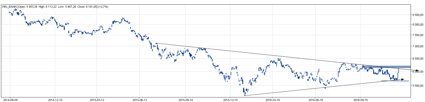 Indeks banków odbił się od wsparcia w dynamiczny sposób i znalazł się tym samym przy podwójnym oporze w postaci zniżkującej linii trendu spadkowego oraz lokalnej bariery ~6150 pkt. Siła wybicia jest imponująca (6,5% w dwa dni), ale dopiero następne sesje wskażą czy mamy do czynienia z przełomem czy też ze zwyczajnym testowaniem bariery wzrostowej.