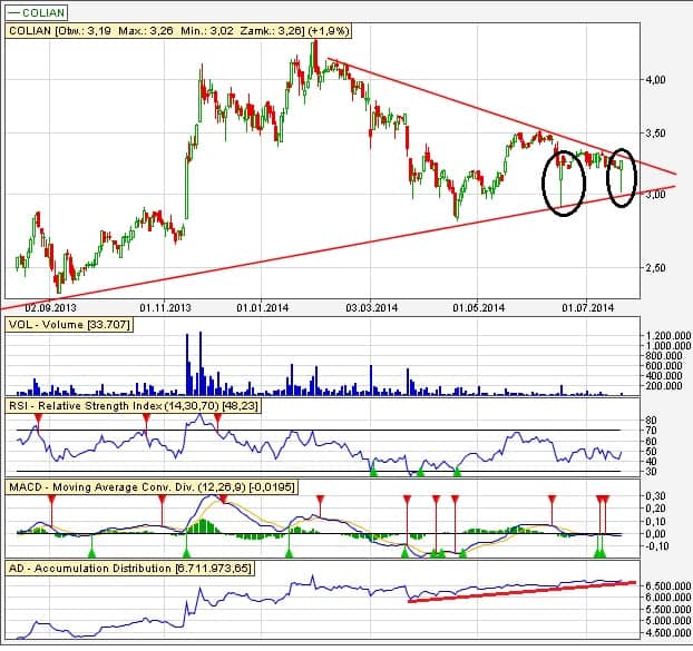 Dwie świeczki, które zaznaczyłem na wykresie mają bardzo pozytywną wymowę. Rejon 2,90 zł będzie więc bardzo mocnym wsparciem i tutaj bym planował ustawić SL. Bardzo ładnie jest respektowana linia trendu głownego, wzrostowego. Teraz jest korekta i dopiero przebicie linii górnej spadkowej umożliwi kursowi dalsze wzrosty. Jest to rejon 3,36 zł. Bardzo mocna wymowa dopiero będzie po przebiciu 3,52 zł. Mamy do czynienia ostatnio z akumulacją akcji, co też wpływa pozytywnie na ocenę stanu (wskaźnik AD).