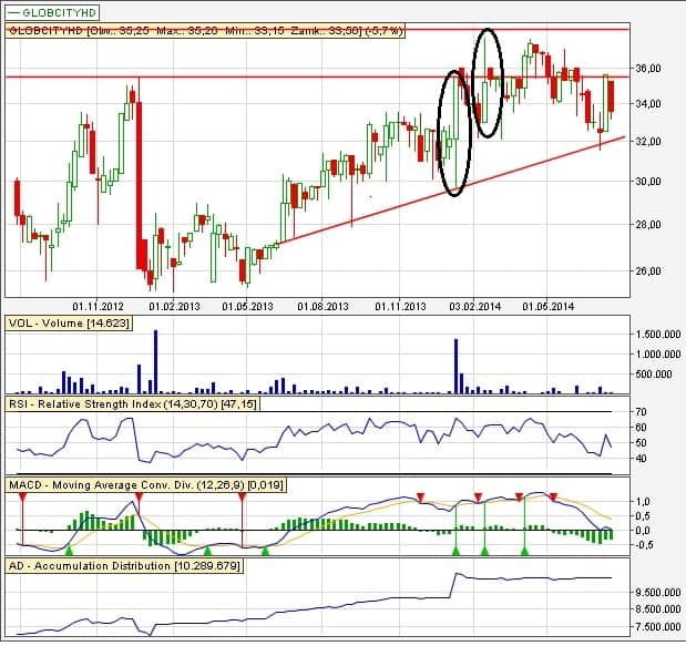 Wykres tygodniowy. Pierwsza zaznaczona świeczka przy bardzo dużym wolumenie. Jest to bardzo mocne wsparcie. W rejonach 29,65 bym planował usadowienie SL. Druga świeczka natomiast to silny opór, który już kilkakrotnie nie został przebity. Dopiero przebicie tych rejonów będzie pozytywne. Na chwilę obecną mamy do czynienia z korektą. Został przespany moment sprzedaży/ew. w złym momencie kupione akcje. Teraz bym ustawił SL i czekał na przebicie oporu, co może trochę potrwać (o ile trend wzrostowy nie zostanie przerwany). I tak jak już było wspominane: nie jest to na pewno płynny walor.