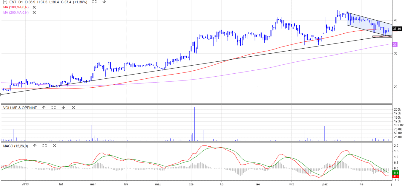 Komentarz: Enter jest spółką analizowaną na naszych łamach systematycznie. Aktualnie kurs ponownie doszedł do linii trendu wzrostowego i tutaj powinna nastąpić jej obrona. Z racji trendu nie wyznaczam TP dla pozycji. SL na 35,10.