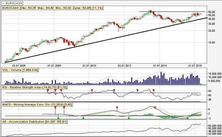 Eurocash znajduje się od początku notowań w długoterminowym trendzie wzrostowym. Oprócz zaznaczonego oporu nie widać żadnych większych negatywnych sygnałów.