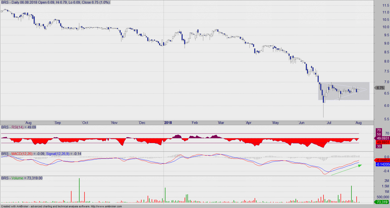 Komentarz: Wykres BRS w ostatnich tygodniach zdecydowanie się uspokoił, a taki stan może jeszcze trochę potrwać. Doszukuję się tutaj formacji bazy (jeszcze w fazie budowania) bądź formacji trójkąta symetrycznego (tuż przed wybiciem). W każdym razie jest to pozycja do watch listy, bowiem ruch powinien być silny (niezależnie w którą stronę)
