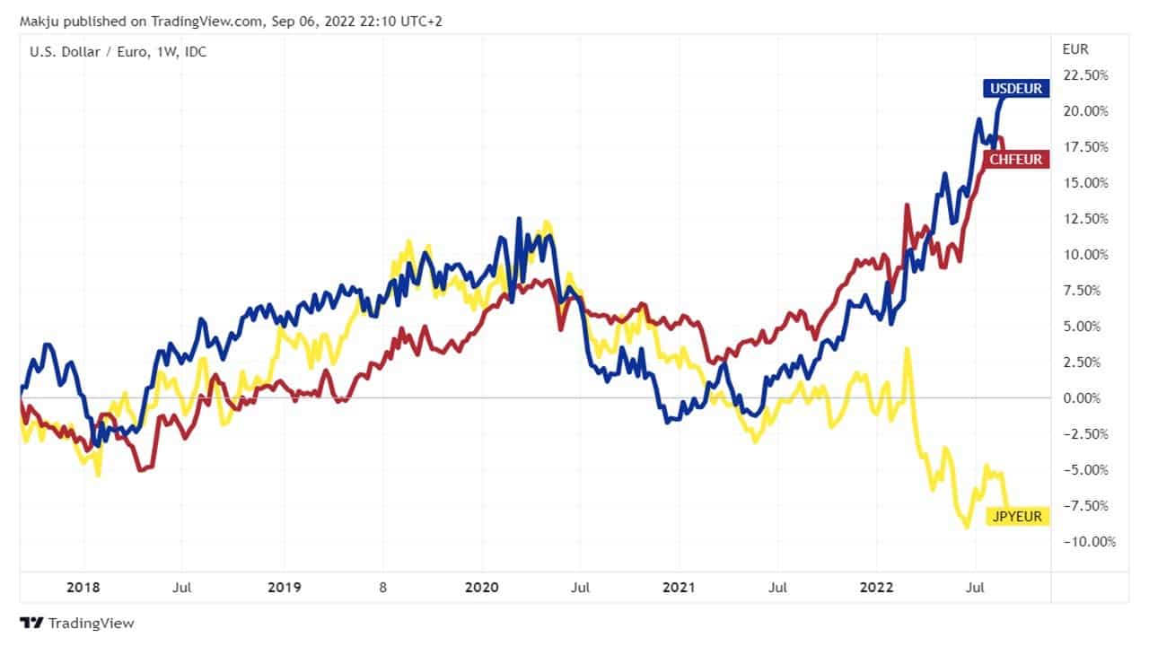 Euro nie jest postrzegane jako waluta bezpiecznej przystani (ang. safe haven). Stąd niech będzie ono wspólnym odniesieniem dla wspomnianej w leadzie trójki. Przeanalizujmy zatem wykres par USD/EUR, CHF/EUR i JPY/EUR w ciągu ostatnich 5 lat. W początkowym okresie – mniej więcej do I połowy 2020 roku – euro było w odwrocie w porównaniu do walut bezpiecznej przystani. Uważa się, że zachowują się one szczególnie dobrze w okresach niepokojów. Umacniały się one wobec euro w czasie wybuchu paniki na rynkach, kiedy na świecie rozpoczęła się pandemia koronawirusa. Tym samym można było powiedzieć, że każda z nich spełniała wówczas kryterium safe haven. Więcej o tym, z czego wynika traktowanie USD, JPY i CHF jako walut bezpiecznej przystani, przeczytasz TUTAJ (od str. 9 opracowania mowa jest o jenie).