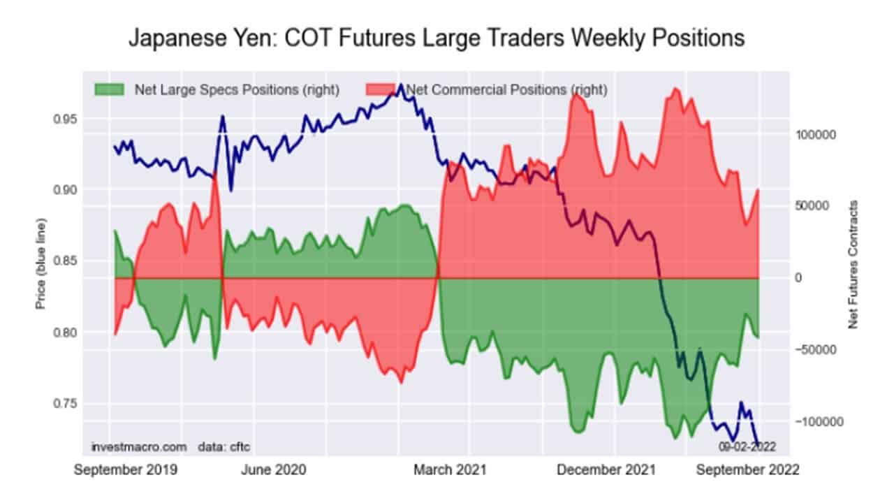 Zaczynając od tych drugich – od dłuższego czasu widać, że jen w transakcjach kontraktami futures jest na potęgę „szortowany” ze strony dużych spekulantów. Tak się dzieje od marca 2021 roku. Choć w ostatnich tygodniach zgodnie z danymi COT, siła zaangażowania obstawiających spadki zdaje się zmniejszać. Na poniższej infografice pozycje netto dużych spekulantów zostały oznaczone zielonym obszarem, zaś kurs jena przedstawia granatowa krzywa.