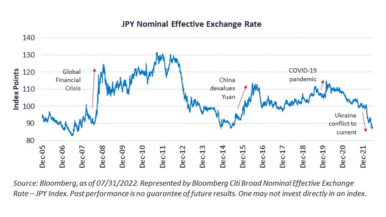 Jen nie tylko słabnie w oczach wobec najważniejszych wspomnianych w tej analizie jednostek monetarnych rynku FX. Dotyczy to także głównych partnerów w wymianie handlowej. Mierzy się to za pomocą efektywnego kursu walutowego (ang. Nominal Effective Exchange Rate – NEER). NEER to indeks średnich ważonych kursu waluty krajowej względem walut państw będących partnerami handlowymi. Waga indeksowa poszczególnych kursów zależy od udziału danego kraju w wymianie.