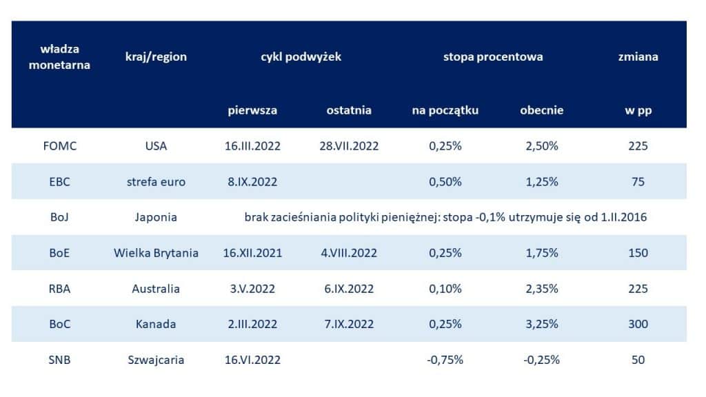 Skala dokonanych podwyżek stóp procentowych w niektórych największych bankach centralnych (USA, Kanada, Australia) od wiosny tego roku przekroczyła już 200 pb. Ostatnio za zaostrzanie polityki monetarnej zabrał się także EBC. 8 września bank strefy euro podwyższył stopy procentowe o 75 pb – z 0,5% do 1,25%. Christine Lagarde, szefowa instytucji, jednocześnie zapowiedziała, że na następnych kilku posiedzeniach dojdzie do kolejnych podwyżek.