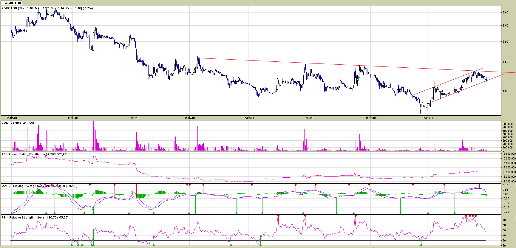 Agroton nadal znajduje się w długoterminowym trendzie spadkowym. Z bliższej perspektywy widzimy jednak mały kanał wzrostowy, którego dolne ograniczenie zostaje poddane testom. Przykładowego LimAkt nie podaję, bowiem zagrywać tutaj można w sposób: a) spekulacyjnego oczekiwania odbicia się od dolnej bandy kanału wzrostowego, b) przebicia się przez zniżkującą linię trendu spadkowego.