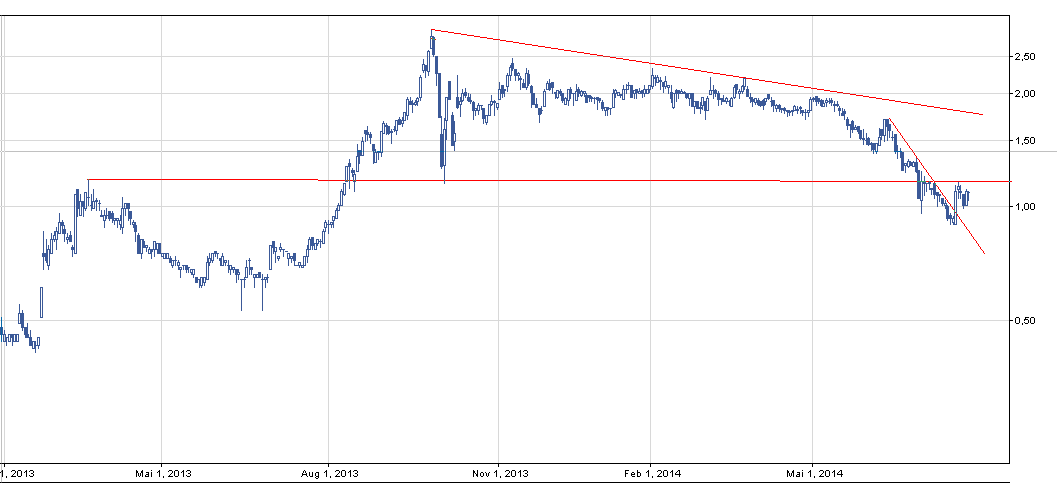 Zeszły rok był dla spółki bardzo dobry. Obecnie trend spadkowy z chęcią przebicia poziomu 1,15-1,18 zł. Przebicie tego poziomu powinien wywindować kurs na poziom następnego oporu, który widzę w okolicach 1,5 zł.