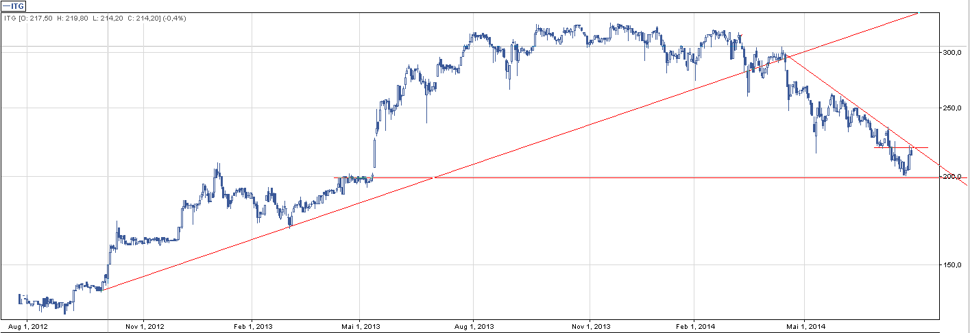 Wykres dwuletni. Spółki nie trzeba przedstawiać; Rafał Brzoska, paczkomaty, inpost… to słowa kluczowe. Od 14.04 zdecydowanie trend spadkowy, który hamował na mocnych 200 zł. Linii trendu spadkowego nie udało się przebić, co widać po górnym cieniu. Limit aktywacji zlecenia ustawiłbym tylko po przebiciu linii trendu. Zaznaczyłem na wykresie dalszy opór na pozimie 219 – 225 zł. Na ogół nic specjalnego, a jedynym pozytywnym znakiem jest bardzo duży wolumen 24.07, który pchnął kurs w górę.