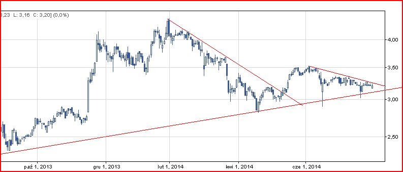 Nadal ciekawy układ linii. Przebicie tej spadkowej linii będzie sygnałem do wejścia. W przypadku fałszywego wybicia zabezpieczyłbym akcje stop lossem na poziomie trendu wzrostowego.