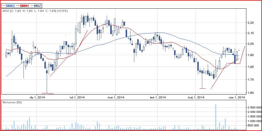 Powyżej wykres Mostostal Zabrze – MSZ, który nasuwa parę ciekawych sygnałów. Zbliżony do początku stycznia młot dał impuls do fajnego zarobku. Analogiczna sytuacja została zaznaczona kreskami na wykresie. Poza tym zbliżają się do siebie dwie średnie kroczące SMA15 i SMA30, a ich przecięcie jest bardzo dobrym sygnałem na rynku. Możemy to zauważyc najpóźniej 30.01, kiedy to ostatnio SMA15 przebiła SMA30 i potwierdziła pozytywne zachowanie rynku. Spółka do zagrania średnioterminowego!