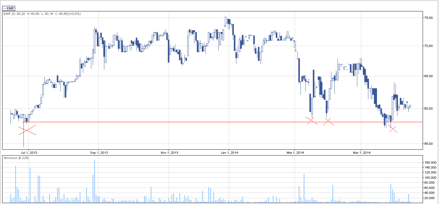 Ciekawy wykres można zobaczyć na spółce Emperia. Zaznaczyłem na wykresie momenty, w których się coś działo na wysokim wolumenie – było to odbicie od wyznaczonego miejsca w górę. Wolumen na piątek nie powalał, ale obrót na poziomie 300 000 zł, to wystarczająco, aby wejść i wyjść dla normalnego gracza.