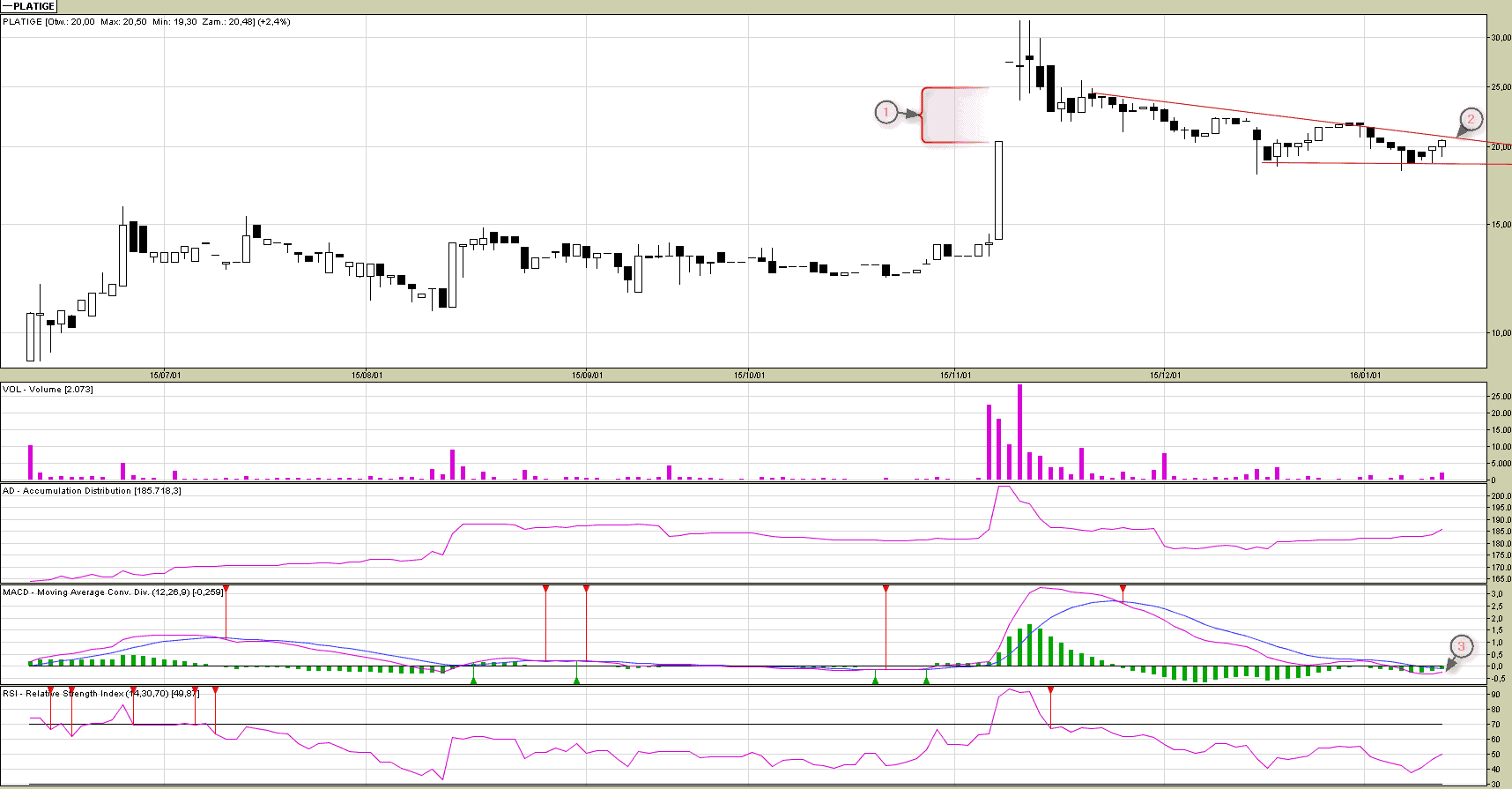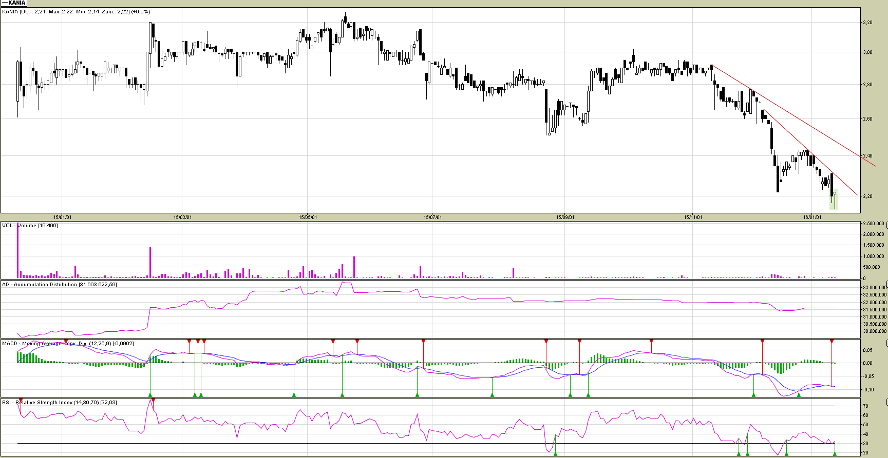 Komentarz: Kurs spółki po dynamicznych wzrostach, które nastąpiły na bardzo mocnym obrocie, zaczął się osuwać. Dwumiesięczna korekta na walorze nastąpuje na małym obrocie, co jest pozytywnym znakiem i daje nadzieję na kontynuację wzrostu. (1) to luka hossy, która stanowi jak dotąd solidne wsparcie przed ewentualnymi spadkami. Luka została de facto domknięta już w zeszłym roku, ale nie doszło do żadnego mocniejszego ruchu. My zagrywamy pod przebicie zniżkującej linii (2), czyli w okolicach 20,8 zł. Ze wskaźników pozytywnie zaskoczyć może MACD, który tworzy sygnał kupna (3).
