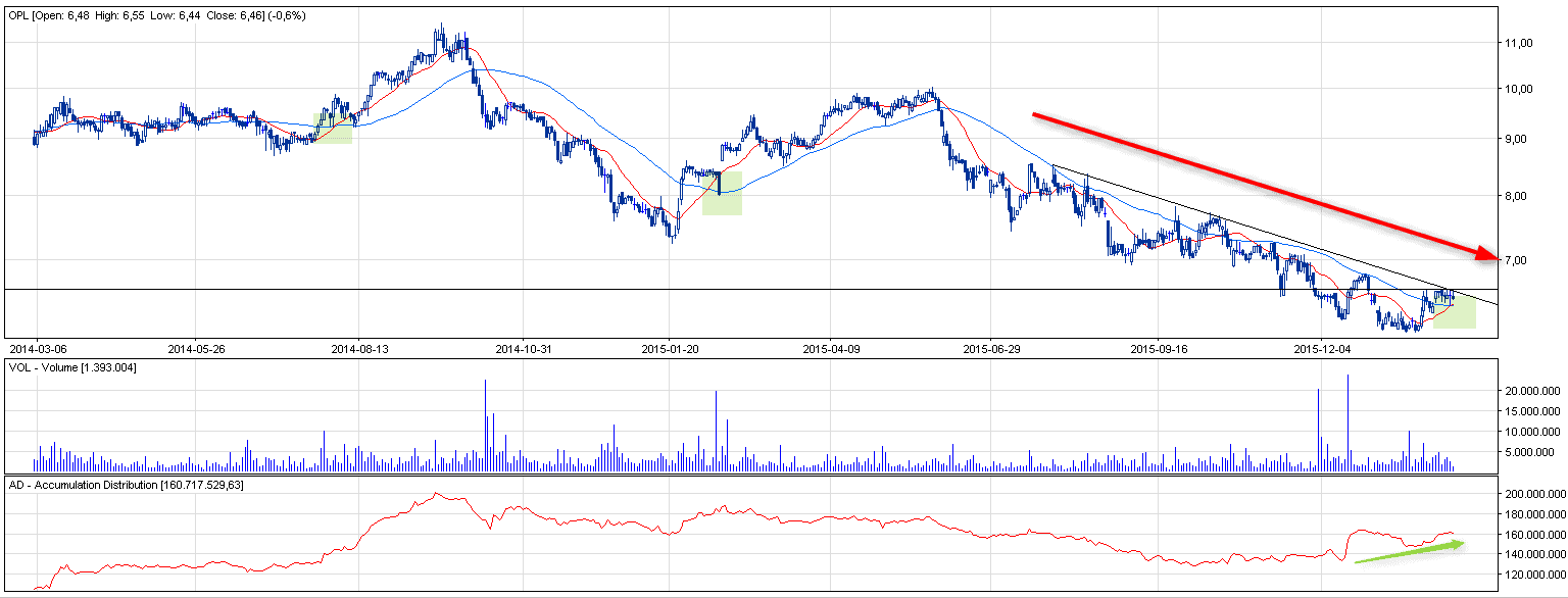OrangePL, podobnie jak wiele walorów z indeksu WIG20, znalazło się w ciekawym ułożeniu technicznym. Długoterminowy trend spadkowy stoi przed przeszkodą z uwagi na tworzącą się formację złotego krzyża. Formacja złotego krzyża, to w sygnał kupna na walorze, który objawia się przecięciem średnich kroczących: średnia krocząca SMA15 przecina od dołu średnią kroczącą SMA45. Ponadto zauważalna jest potencjalna pozytywna dywergencja między wskaźnikiem AD, a wykresem – wskaźnik AD kontynuuje wzrost, podczas gdy sam kurs waloru zniżkuje. Zagrywać będzie można pod przebicie się przez lokalny opór, który broniony jest przez linię trendu zniżkującego. Przykładowy LimAkt to 6,61 zł. Realizacja LimAkt powinna ruszyć kursem wstępnie do następnego oporu, który znajduje się na okrągłych 7 zł. Stopa zwrotu wyniosłaby w tym przypadku po odliczeniu kosztów prowizji 5 % (zakładając prowizję na poziomie 0,38 %). Najbliższe wsparcie znajduje się na 6,35 zł.