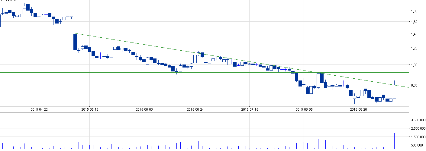 Komentarz: Spółka w końcu doczekała się swojej chwili, pytanie tylko na jak długo. Dzisiejsza świeca utworzyła się na ponadprzeciętnym obrocie, ale nie zdołała jednoznacznie sforsować zaznaczonej linii trendu spadkowego. Mimo tego, wzrost o niemal 16 % jest imponujący. O ile spółka ma zamiar odmienić swój los, to konieczne jest zdecydowane przebicie powyższej linii oraz zamknięcie się nad 92 gr, gdzie widoczne jest pierwsze poważne wsparcie. Taki scenariusz oznaczałby potencjalny wzrost nawet do obszaru dużej luki spadkowej, ~1,6 zł, ale póki co brakuje paliwa do wzrostów w postaci konkretnych informacji. Realny scenariusz zakłada w optymistycznym wariancie następujące opory: 1 , 1,14, 1,26, 1,4. Solidnym wsparciem jest 65 gr, które opiera się na historycznej luce wzrostowej z 2009 r.