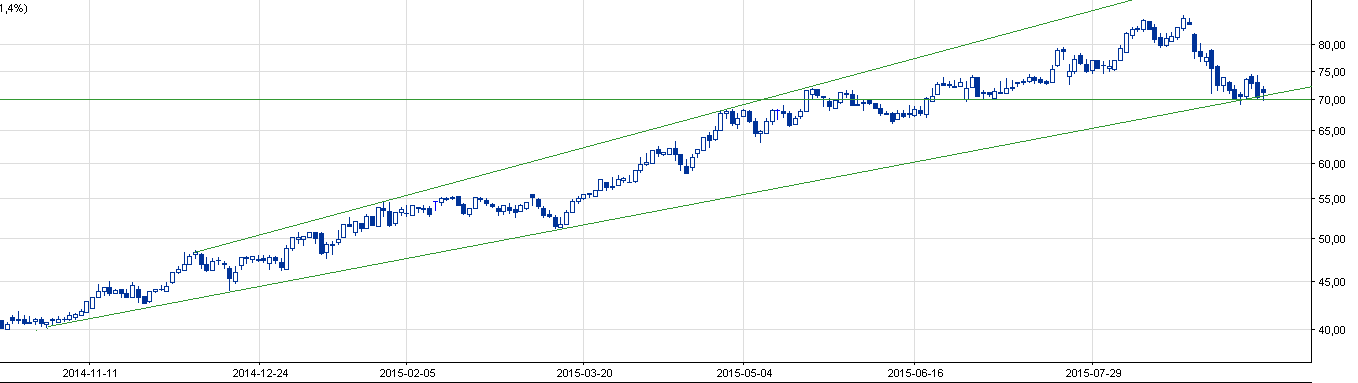 Na wykresie średnioterminowym, widać natomiast złamanie trendu wzrostowego, ponadto kurs oscyluje pod psychologicznym poziomem 70 zł.