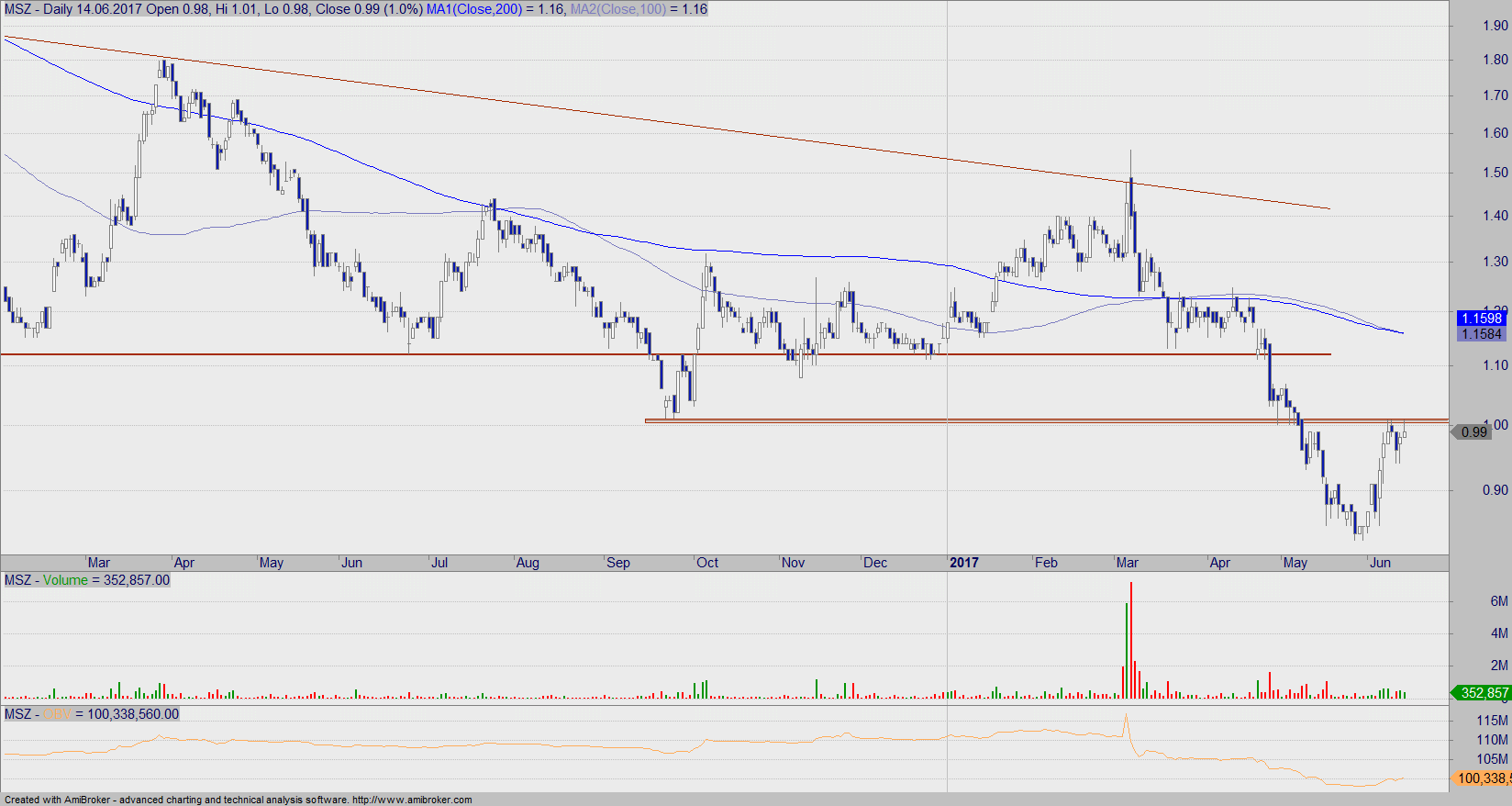 Komentarz: Wykres budowlanej spółki MSZ jest jednoznacznie spadkowy, a ostatnie sesje, to walka pod wybitym w maju wsparciu, a teraz oporze. Z uwagi na panujący trend większą szansę ma strona podaży, aczkolwiek z uwagi na szanowanie zasad AT spółka trafia na listę obserwacji. Najbliższe wsparcie znajduje się przy 0,94, tzn. SL na 0,93.