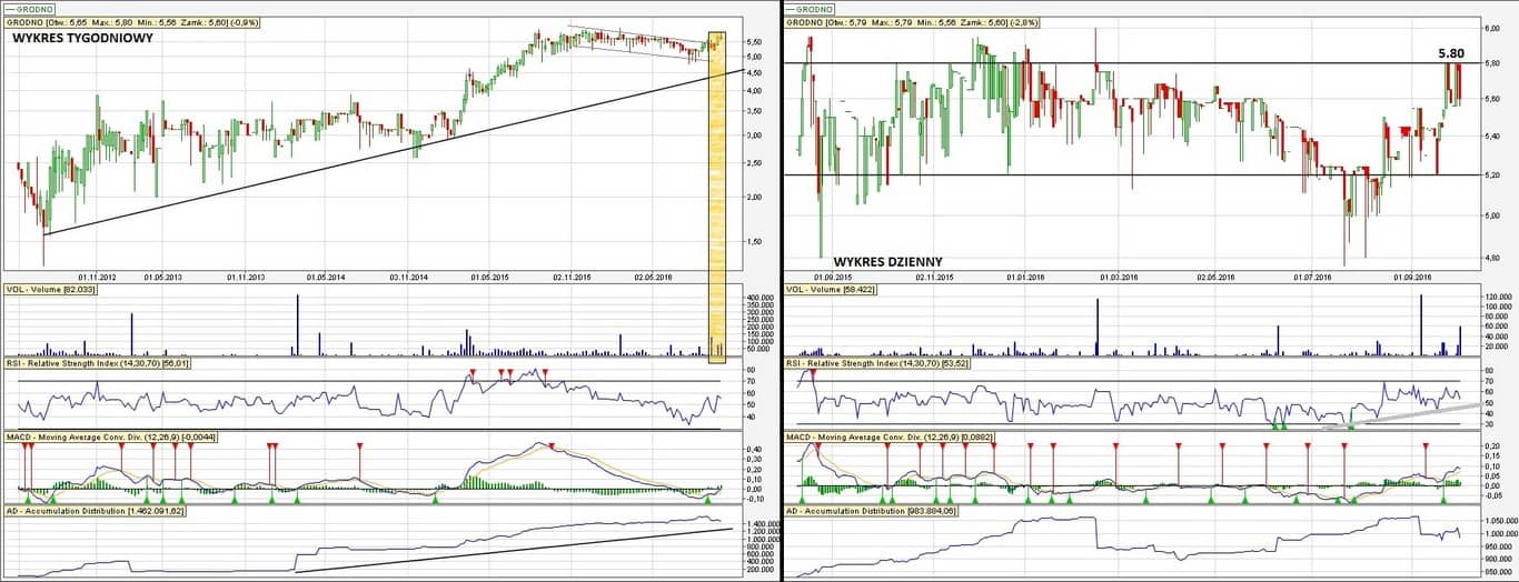 Komentarz: spółka od roku znajduje się w trendzie bocznym. Trend boczny zazwyczaj właśnie następuje po mocnych, silnych wzrostach (takie nastąpiły w 2015 roku). Jest to tzw. przystań przed kolejnymi wzrostami (dalej mamy trend wzrostowy w szerszej perspektywie). Na ostatnich sesjach widoczna jest próba przełamania kanału bocznego (patrz wykres dzienny). Odbywa się to przy zwiększonym wolumenie. Przed tymi wzrostami nastąpiło jednak małe załamanie z 5,20 na 4,80. Jest to tak zwane “testowanie dna”, które również często występuje przed mocniejszymi wzrostami.