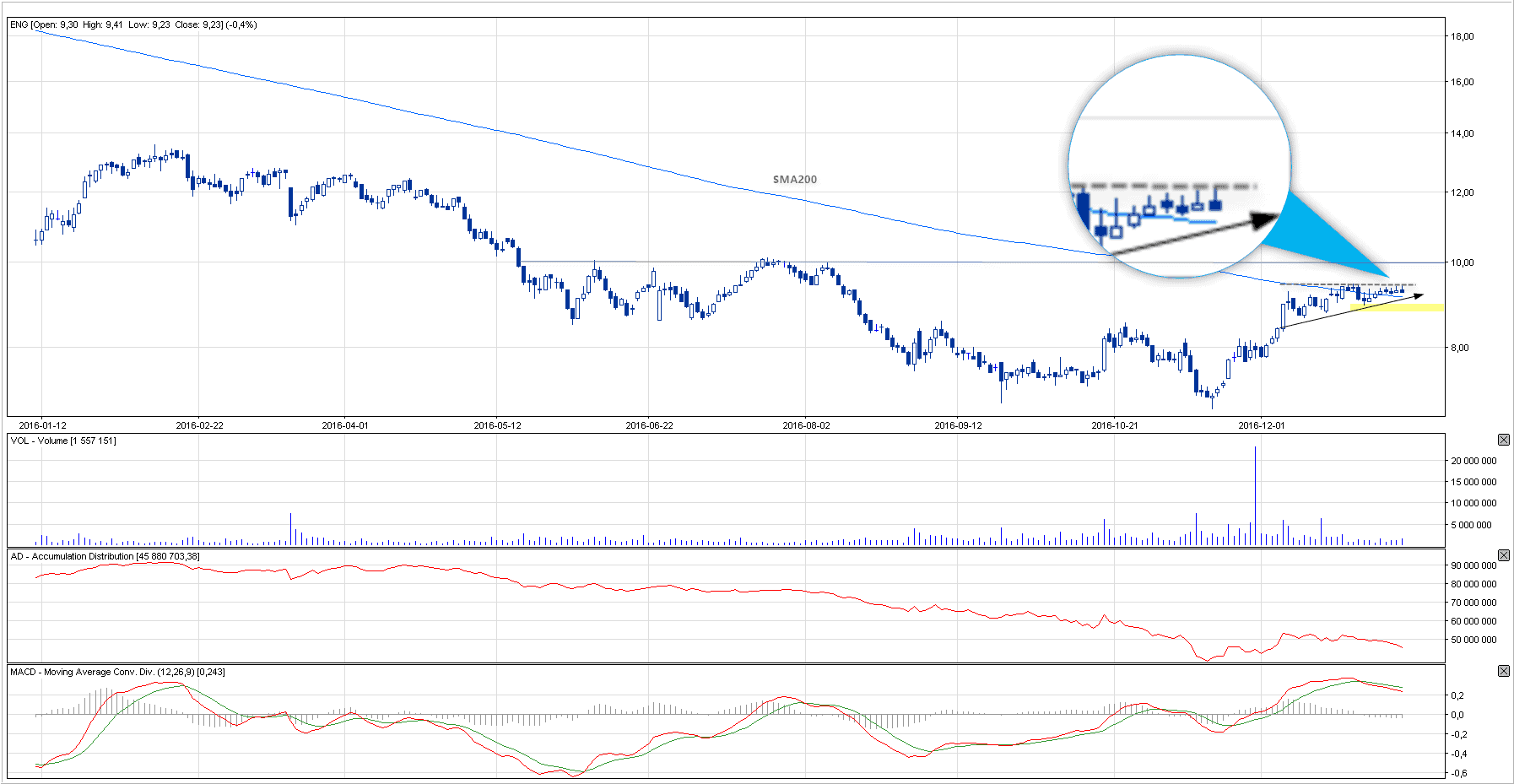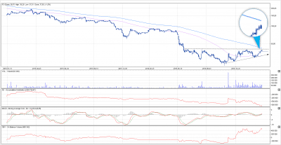 Komentarz: Wykres Energi wygląda prowzrostowo z paru powodów: a) sekwencja wyższych dołków i szczytów od , b) przebicie się przez długoterminową linię trendu spadkowego, c) przebicie się górą przez średnie kroczące (w tym SMA200). Byczo wygląda także wskaźnik OBV, który w przeciwieństwie do AD (na wykresie) wykazuje na dalszą akumulację papiera, a jeżeli dołożymy do tego MACD, to mamy czekamy na finalne utworzenie sygnału zakupu, który powinien aktywować zwiększoną podaż. Prowzrostowy obraz zostanie w krótkim terminie zanegowany, jeżeli kurs zejdzie poniżej 8,94, byki natomiast powinny zaatakować po przebiciu 9,44 i tutaj też ulokowałbym zlecenie kupna.