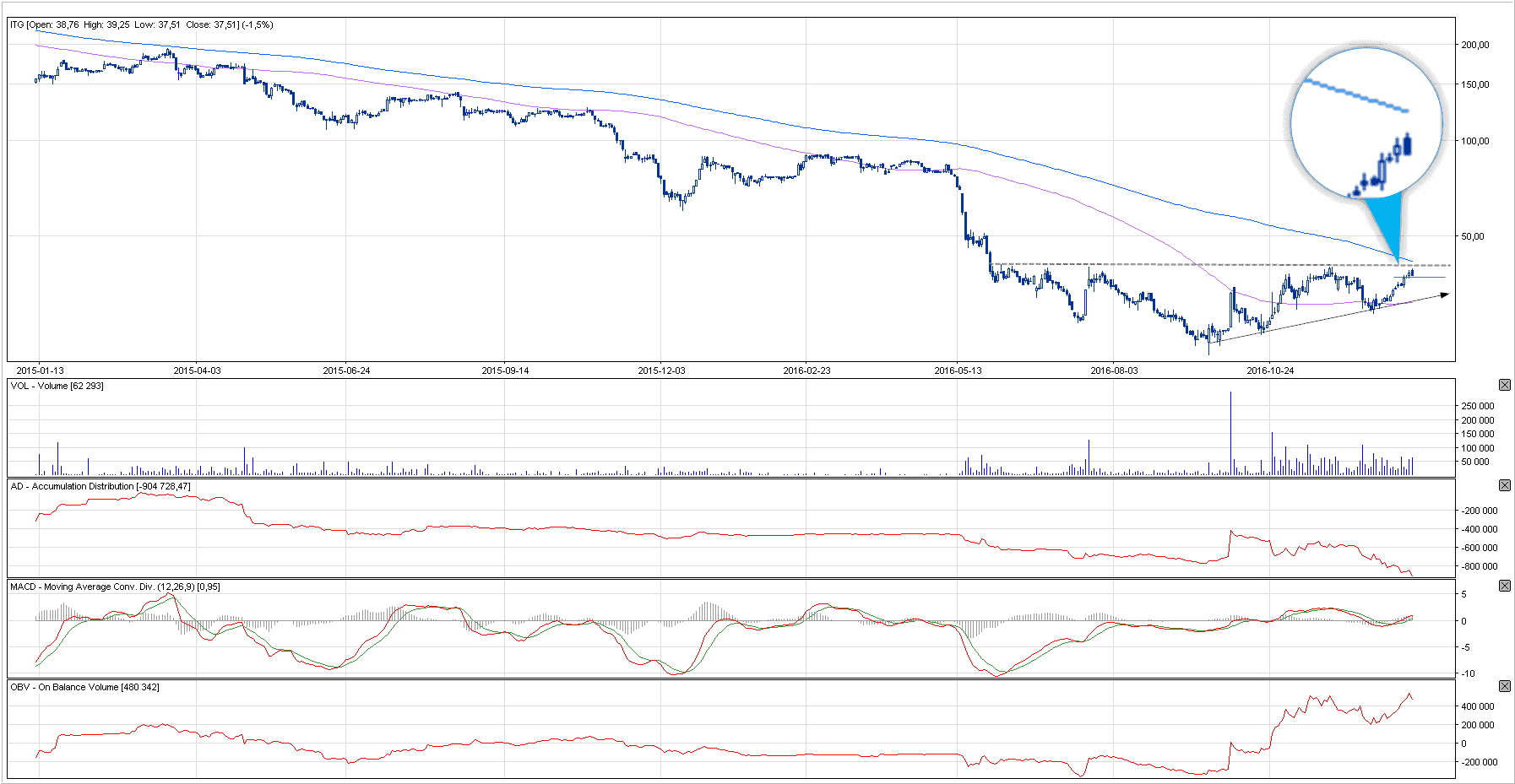 Komentarz: Także tutaj SMA200 odgrywa kluczową rolę dla kursu, z tymże ITG w przeciwieństwie do ENG nadal znajduje się pod tą średnią. SMA100 została przebita już jakiś czas temu, a kurs po raz n-ty próbuje swoich sił z oporem na 40 zł, gdzie znajduje się właśnie wspomniana dwusetka. Wybicie nad wskazany poziom jednoznacznie powinien aktywować siłę byków, a jeżeli tak się stanie, to spekulacyjne zagrywki na walorze powinny przejść do historii. Do tego czasu traktuję papier jako z podwyższonym ryzykiem. Najbliższe wsparcie znajduje się przy 36,45, a następne przy 36.