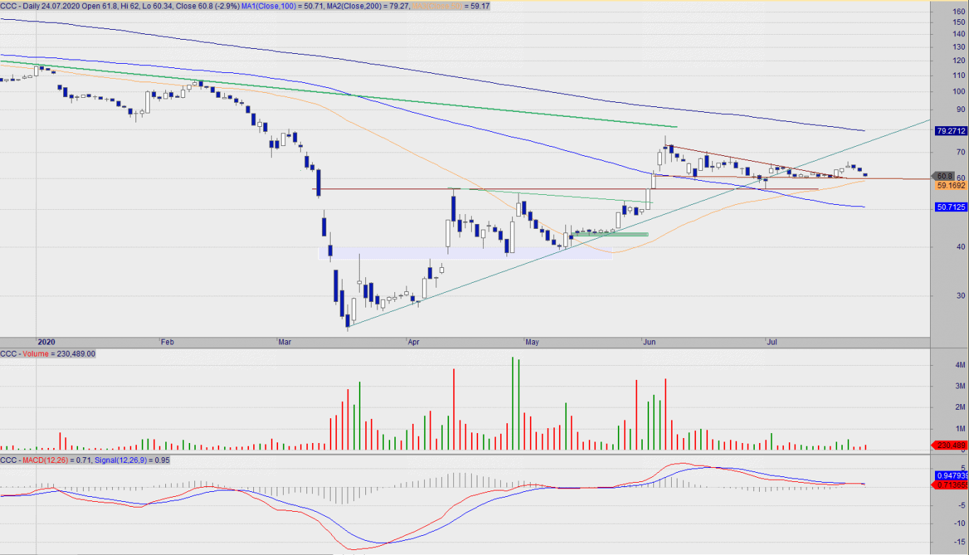 Kurs wraca do punktu zero, czyli skąd pojawił się impuls wzrostowy z 17.07. Wybicie SMA50 (59,20~) traktować będę jako realizację scenariusza spadkowego w krótkim terminie. Opór na 66 zł został potwierdzony.