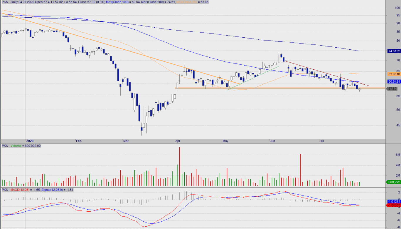 Przyszły “multikoncern energetyczny” ponownie testuje wsparcie na 57,50, które już raz zostało potwierdzone w okresie kwiecień-maj. Nie jest to idealne miejsce do zajęcia jakiejkolwiek pozycji, ponieważ dopiero wybicie nad SMA100, tudzież linii trendu spadkowego od czerwca br. powinno być sygnałem zakupu (wówczas pojawić powinien się także sygnał kupna na MACD). Z drugiej strony wybicie aktualnego wsparcia, to zaproszenie do falki spadkowej w kierunku ostatniego minimum. Patrząc na wolumenu świec spadkowych skłaniałbym się ku drugiemu scenariusza (spadkowego).