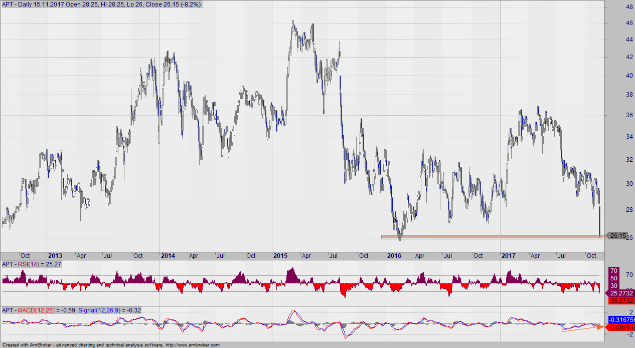 Mocne tapnięcie o sile 8,2% i mamy tym samym powitanie poziomu z początku 2016 roku. Wykres tkwi w trendzie bocznym, zatem możemy jeszcze mówić o okazji inwestycyjnej. Wybicie obecnego wsparcia, to szybki test 25 zł, a następnie 20 zł.