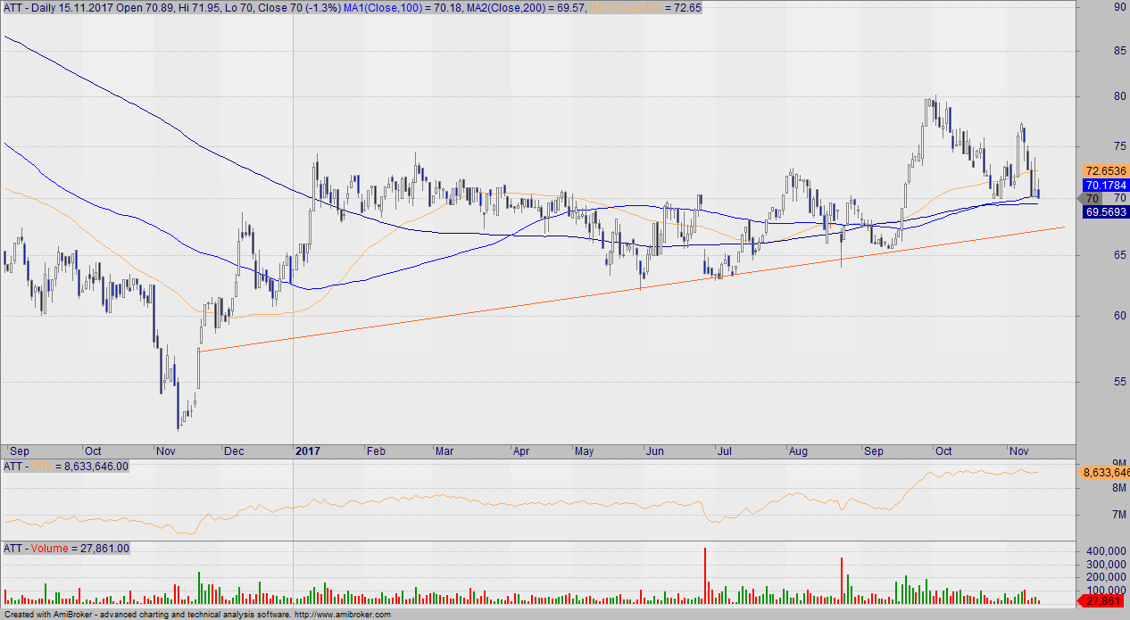 ATT blisko srednioterminowej linii trendu wzrostowego.
