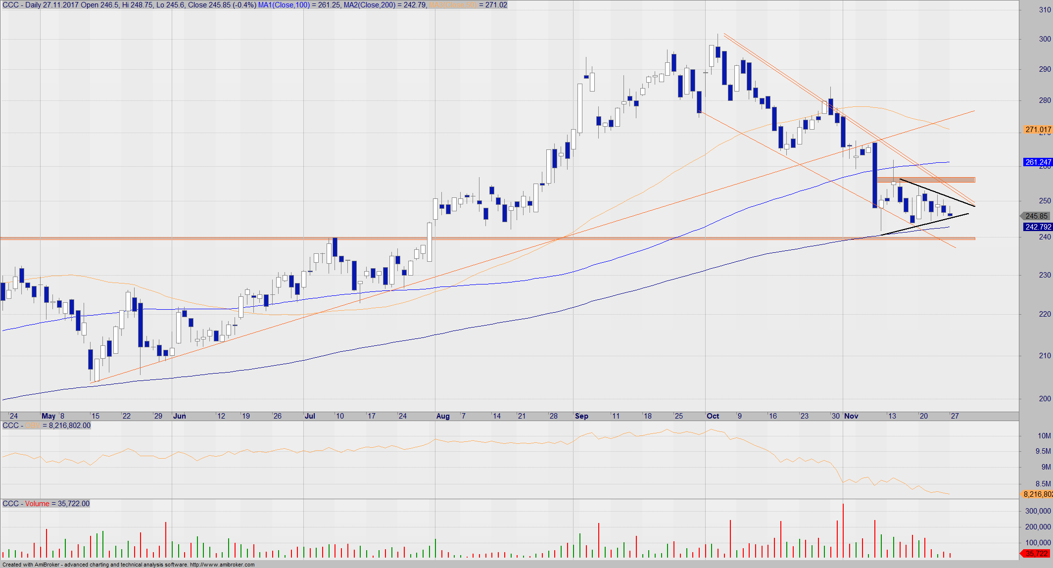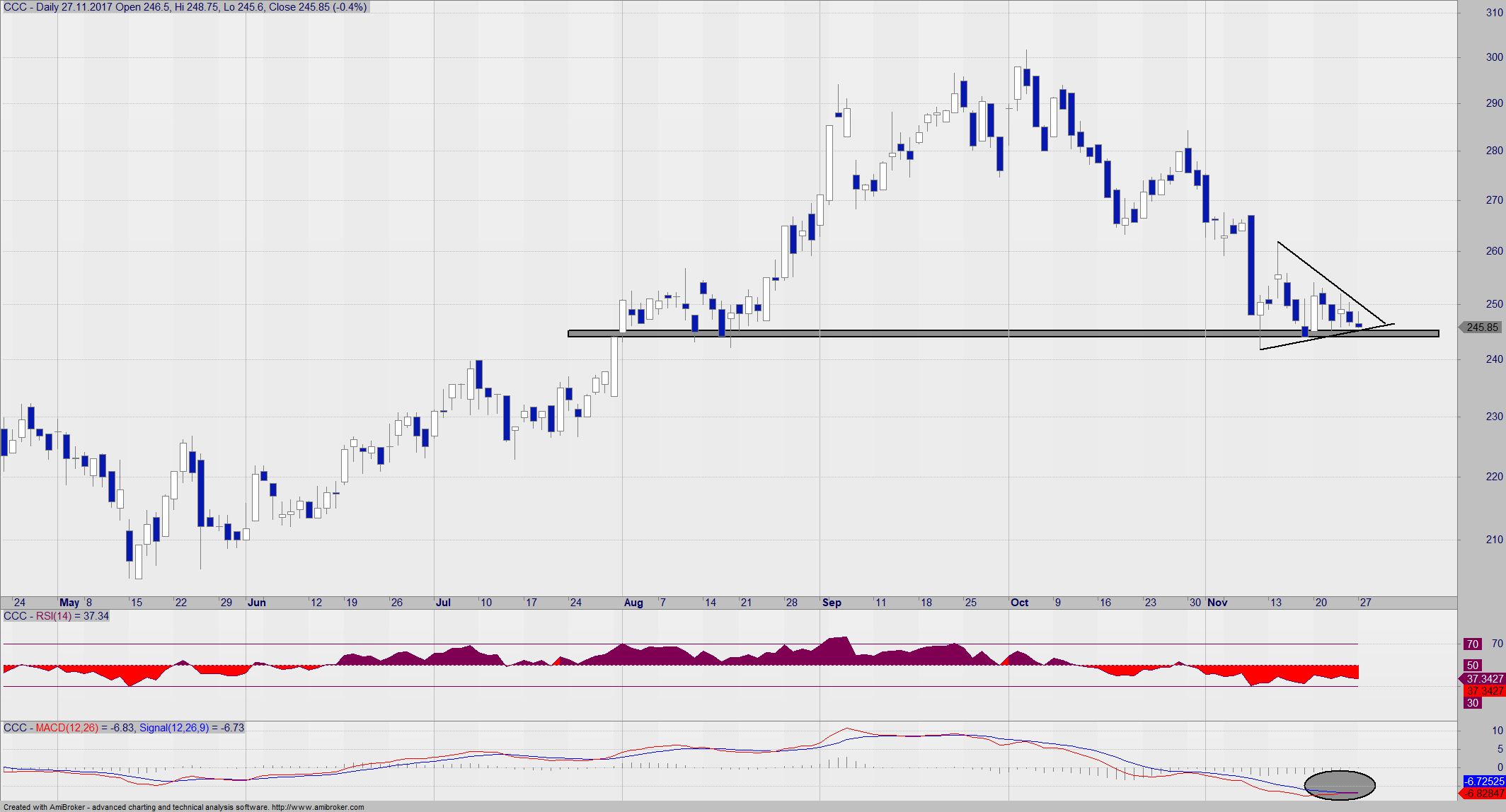 Uważam, że CCC zmierza do wsparcia na 240 zł. We wtorek była szansa na wybicie z formacji ale podaż nie pozwoliła na ten krok a wczorajsza sesja to dalsza podaż. Nie widać popytu, aczkolwiek tak jak napisałeś nastąpiła obrona wsparcia na wykresie tygodniowym. Czekamy na jakiś mocniejszy ruch czy to w górę czy w dół.