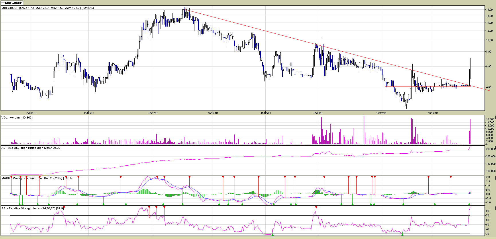 Na MBF widzimy trend spadkowy oraz formację trójkąta zniżkującego, który został wymęczony do samego końca, co nie zdarza się często. Wybicie nastąpiło na odpowiednim obrocie i zdołało przebić potencjalny zasięg formacji. Przykładowego LimAkt nie podaję, ale warto spojrzeć na dalsze poczynania notowań na następnych sesjach.