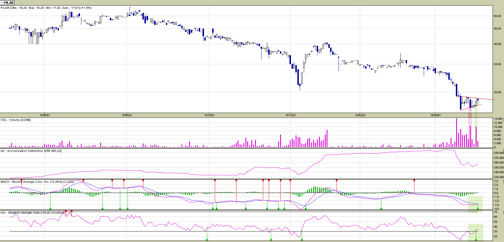 Komentarz: Na Pilabie tworzy się trójkąt symetryczny, którego poprawnie należałoby nazwać proporcem z uwagi na krótszy okres formowania. Pozytywnie wygląda utworzony na ostatnich sesjach sygnał kupna na głównych wskaźnikach – RSI, który po małej konsolidacji przebił dolną bandę, oraz MACD. Ponadto zauważalny jest znaczny wzrost dziennego obrotu, który wyniósł na ostatniej sesji 53.000 zł. Wsparcie wyznaczam na 17 zł, jest to miejsce od którego odbiła się ostatnia świeczka z uwagi na połowę świecy powstałej na dużym obrocie. Pierwszy obrót znajduje się na 20,4 zł.