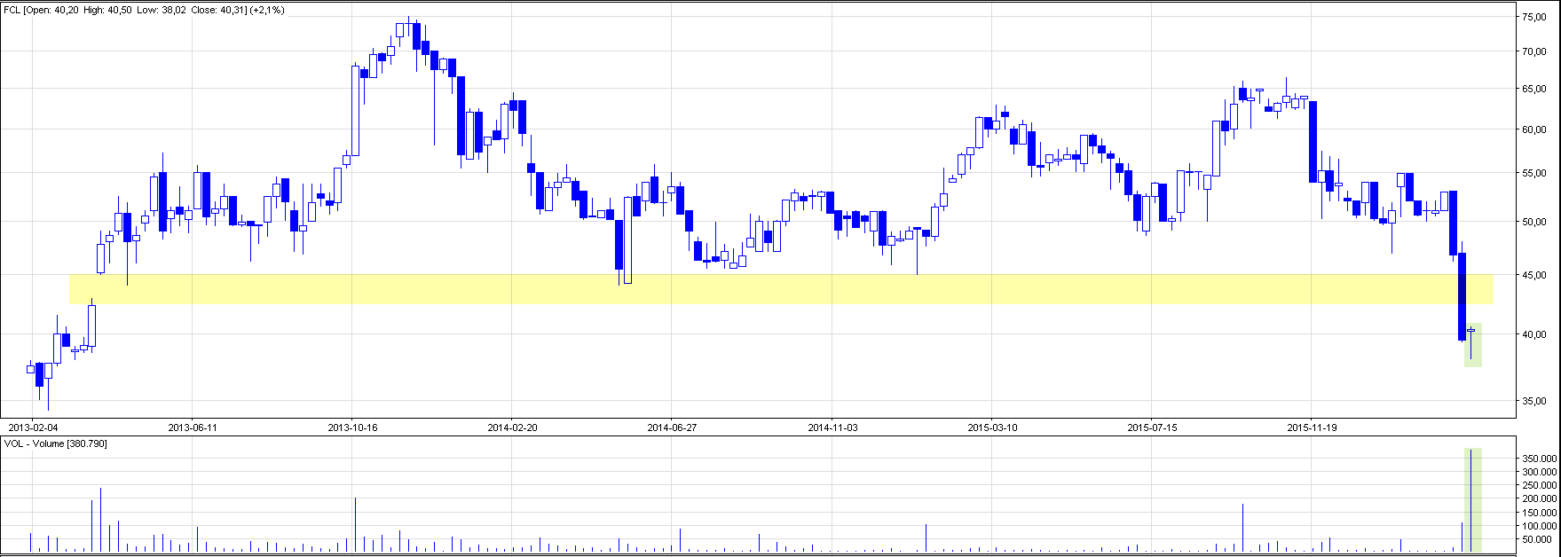 Komentarz: Spółka została zauważona przez naszą czytelniczkę. Zgodnie z tym, co pisałem w komentarzu, na walorze utworzyła się świeca młot, która w trendzie spadkowym jest potencjalnym sygnałem kupna. Głównym trendem spółki jest de facto trend boczny, aczkolwiek ostatnie mocne zniżki mogą wpasować się w realizację formacji młota. Potwierdzeniem sygnału będą wzrostowe świeczki na nadchodzących sesjach. W przypadku realizacji LimAkt konieczne będzie ustawienie SLa pod dolnym knotem świeczki, tj. 38,02 – SL 37,99.