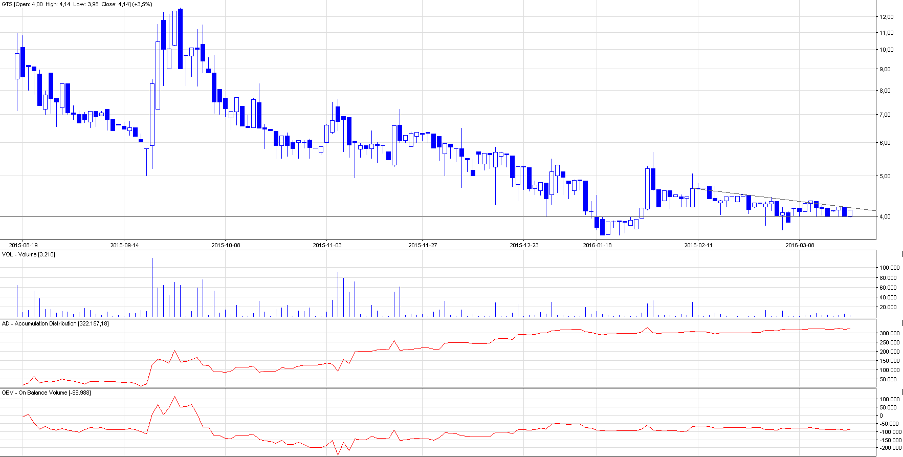Komentarz: Trend spółki znajduje się w bardzo silnym trendzie spadkowym, a przedstawiona formacja należy statystycznie do spadkowych. Walor należy zatem do kategorii “arcyspekulacja”, a jedną z przesłanek ewentualnego wybicia górą, jest informacja na temat rekordowego portfela zamówień. Artykuł jest z 16. marca, a od tamtej pory na wykresie za wiele się nie stało. Bardzo możliwe, że kurs będzie się konsolidował do samego czubka trójkąta, aby za parę dni wyznaczyć kierunek. Obrót na spółce wynosi średnio 10.000 zł na 17 transakcjach – jest to walor małopłynny, rzekłbym nudny. Ewentualne wejście jedynie małym kapitałem i po przejrzeniu arkusza zleceń – na życzenie mogę udostępnić pełny, aktualny arkusz w trakcie sesji, proszę o krótką informację. Najbliższe opory po pokonaniu LimAkt to 5 zł, 5,3 zł.