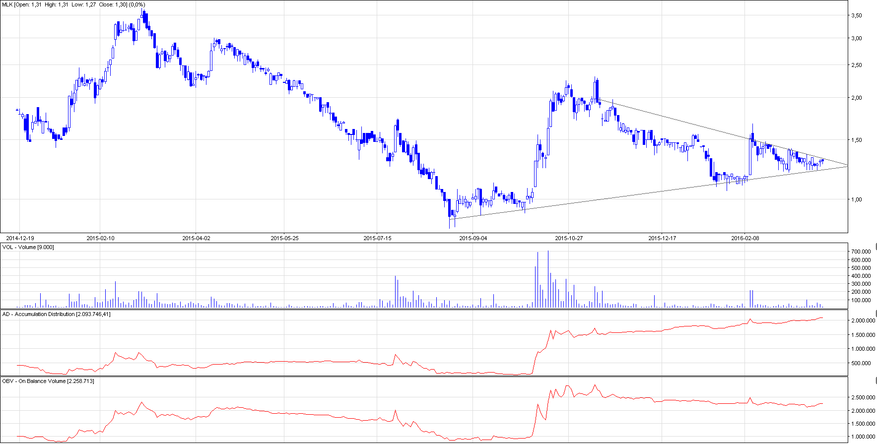 Komentarz: Trend spółki nie różni się bardzo niczym od poprzedniej spółki, aczkolwiek w tym przypadku mamy do czynienia z pozytywnie wyglądającymi wskaźnikami akumulacji AD/OBV. Także tutaj dochodzi do co raz mocniejszego zawężenia trójkąta, który w najbliższym czasie powinien zostać przełamany. Najbliższe wsparcie wyznaczam na 1,2 zł, a na opory 1,44 zł oraz 1,68 zł.