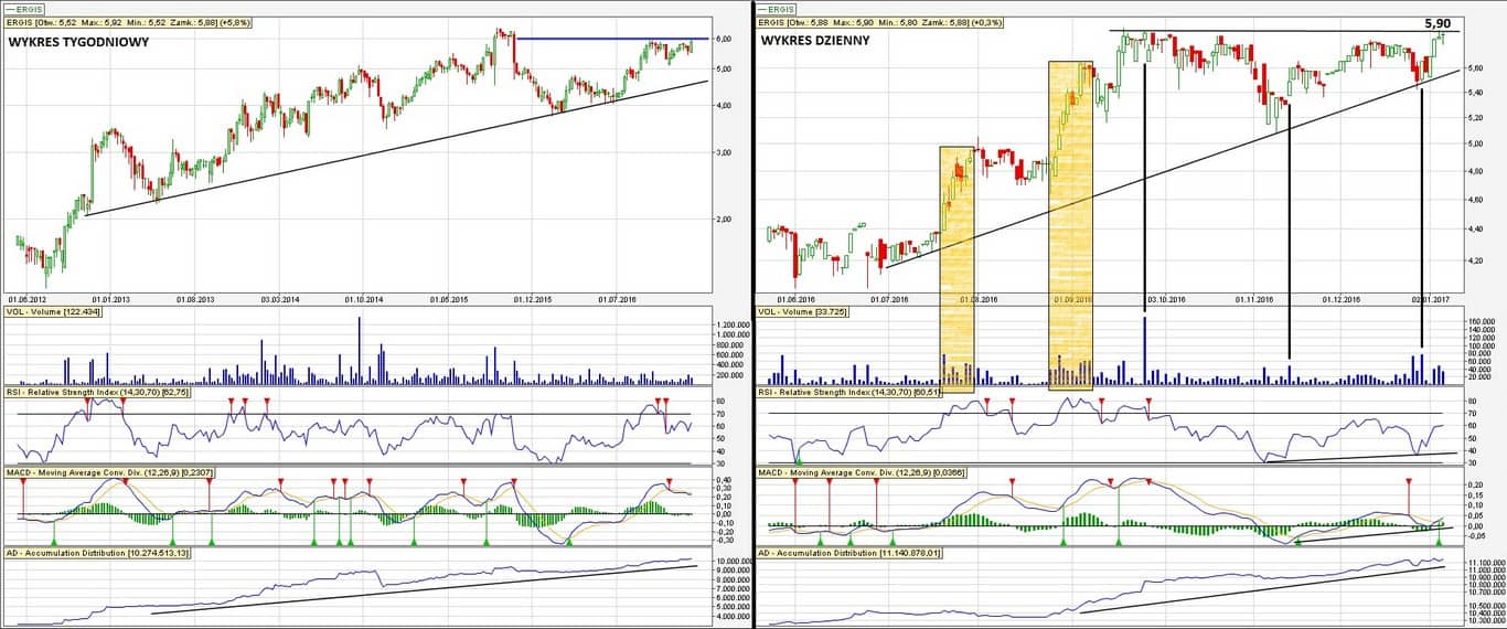 Komentarz: Ergis również jest bardzo dobrą spółką pod długoterminową inwestycję. Bardzo ładny trend wzrostowy poparty szeregiem świec dziennych. Wybicie z poziomu 5,90 zł powinno być dynamiczne.