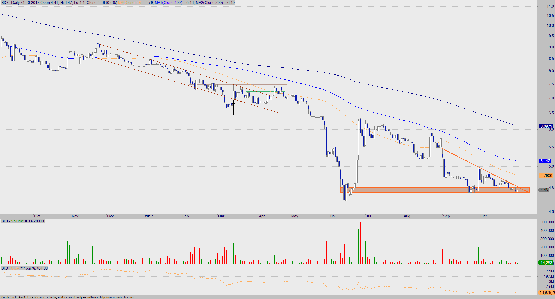 Na koniec dorzucam mały bonus w postaci spadkowego Biotonu. Nie jest to papier na dłuższą metę, ale momentami można złapać rajd na paręnaście procent. Obecnie kurs przylepił się ponownie do wsparcia, a spekulanci w tym momencie mogą zdecydować czy spróbuja zagrać na przebicie górnej linii trendu spadkowego.