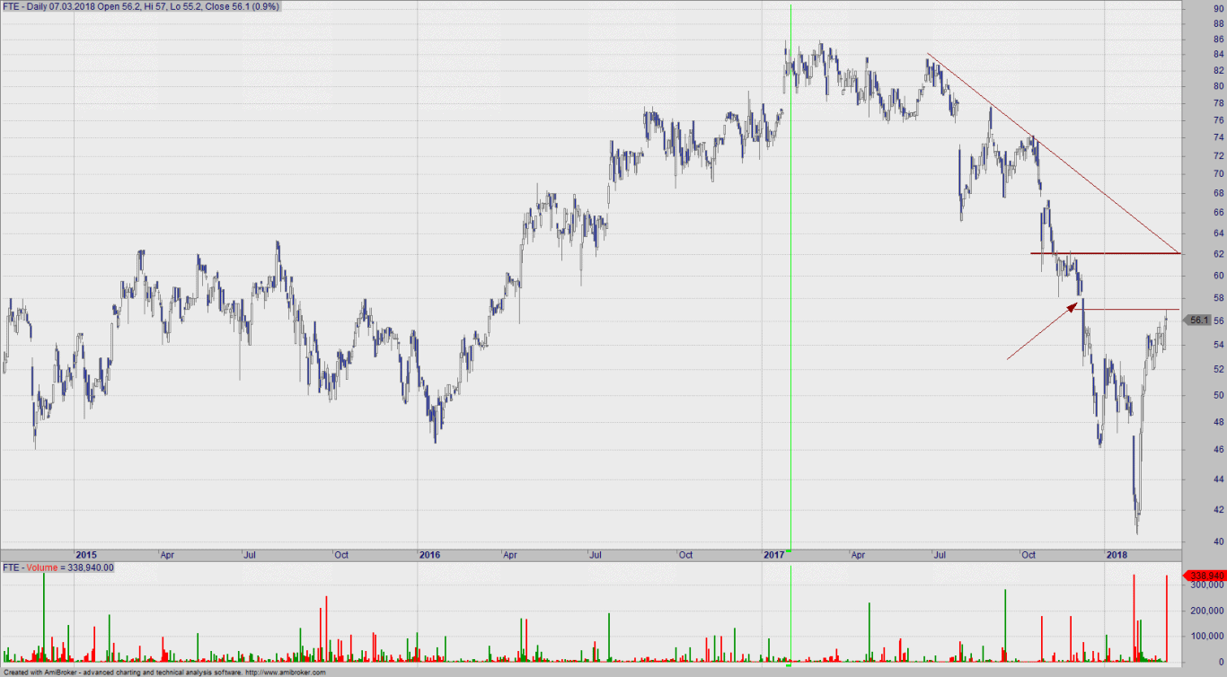 Sytuacja na wykresie Forte, jest dosyć odmienna, bowiem kurs w przeciwieństwie do Pfleiderer nie znajduje się już w czystym trendzie wzrostowym. Obecnie należy przyjąć, że kurs FTE porusza się w długim terminie w boczniaku. Na dużą uwagę zasługuje środowa sesja, na której doszło do utworzenia dużego obrotu, ale kupującym ostateczie nie udało się wyjść nad lokalną konsolidację. Wybicie z konsolidacji de facto nie zmieni średnioterminowego obrazu wykresu, chyba że stronie popytowej uda się wyjść nad 62 zł. Od początku lutego br. do teraz kupującym udało się wywindować akcje spółki o blisko 40%, co jest bardzo dobrym wynikiem. Nie pozostaje niespodzianką, że akcje spółki na początku lutego były po prostu za tanie, a reakcja rynku okazała się zbyt impulsywna.