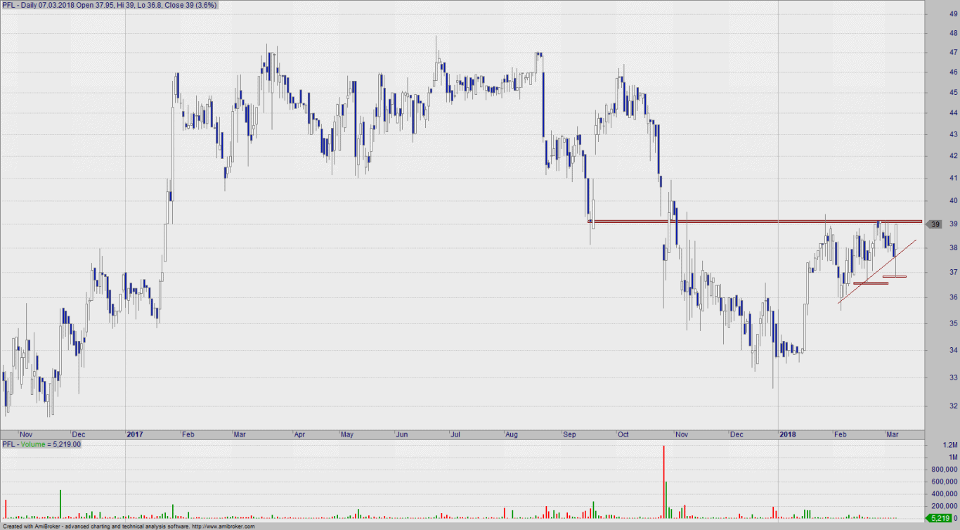 Z perspektywy długoterminowej trend spółki jest pod stałą kontrolą byków. Średnioterminowo zauważalny jest pewien marazm, aczkolwiek od początku roku widać wyraźny zwrot od ustanowionych minimów – standardowe pytanie i co dalej? Widzimy gołym okiem, że na 39 zł tworzy się solidna bariera, która nie pozwala kursowi na dalszy ruch wzrostowy. Z drugiej strony mamy sekwencję wyższych dołków, a zatem popyt nie pozwala na przejęcie dominacji przez obóz niedźwiedzi. Gdyby nie główny, wzrostowy trend wykresu, zapewne przez dłuższy czas nic by się nie stało. Aczkolwiek ostatnie spadki póki co wpisują się w wieloletni schemat korekt, a co za tym idzie: walor nie powinien się już cofać. Grzecznie czekamy na atak kluczowego oporu, którego przebicie skutkować będzie finalnie nowymi szczytami (cel długoterminowy).