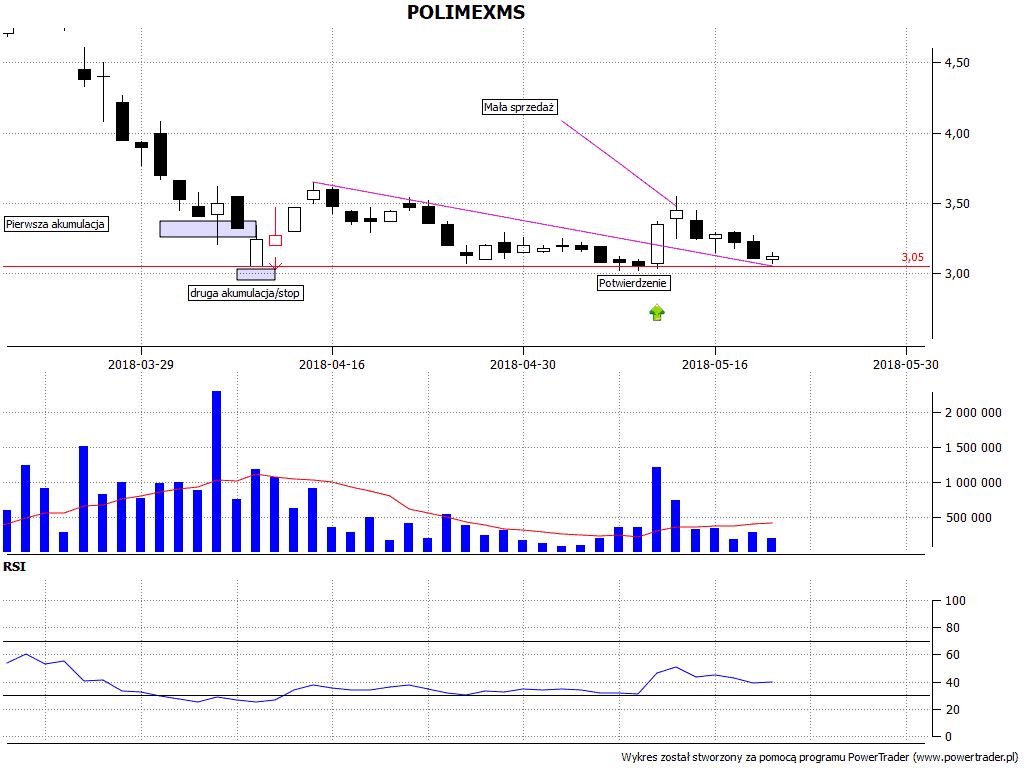 Mamy ciekawy układ i silne wsparcie w okolicy 3 zł. Aktualnie kurs dotarł do ważnego poziomu a zanik obrotu może świadczyć o tym że już na kilku najbliższych sesjach poznać możemy dalszy kierunek. Ktoś kto śledzi notowania ,,inra day” na pxm zauważył pewnie że ruchy są tu silne, niespodziewane a poziomy pokonywane są serią szybkich dużych zleceń. Często wzrost lub spadek nie jest poprzedzany jakąś konkretną świecą na zwiększonym obrocie a zlecenia popytowe czy podażowe realizowane są z ,,ręki”. Tutaj zagrywał bym na utrzymanie wsparcia z SL gdzieś poniżej 3 – 5 % od wsparcia. Największym minusem zagrywania na takiej spółce jest wciąż ogromy nawis podaży czyli osób lub podmiotów wychodzących po ,,odbiciu” akcji ze względu na zakup na znacznie wyższej cenie co nie wnikając w sytuację fundamentalną można łatwo wyczytać z wykresu.