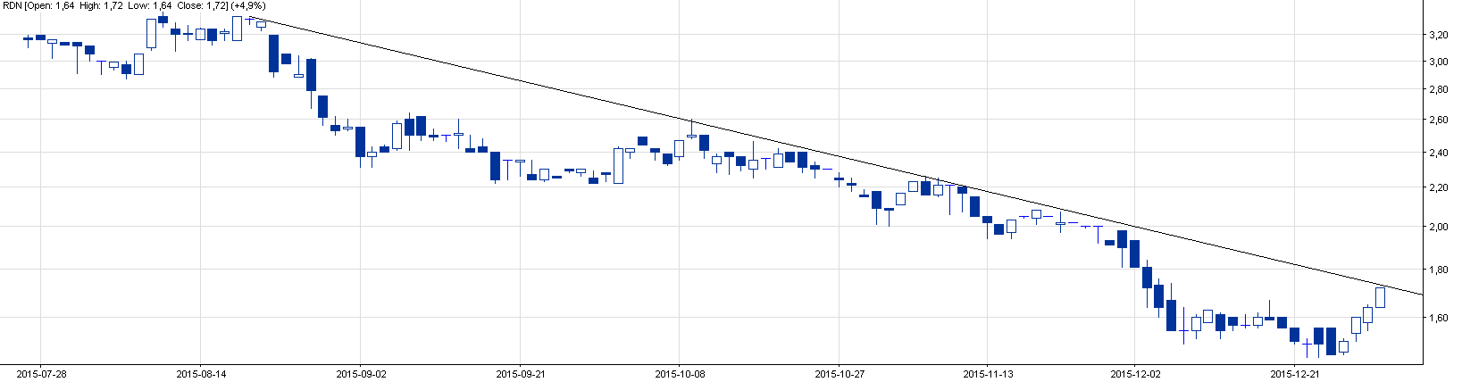 Pod koniec zeszłego roku przedstawiłem naszym zarejestrowanym użytkownikom możliwy wzrostowy scenariusz na Redanie. Analiza opierała się na spekulacyjnym zakupie akcji po 1,5 zł oraz na sprzedaży zakupionego pakietu przy odbiciu do ograniczenia zniżkującego trendu (~1,7 zł). Ja zgodnie z analizą spieniężyłem część pakietu na ostatniej sesji po 1,7 zł: