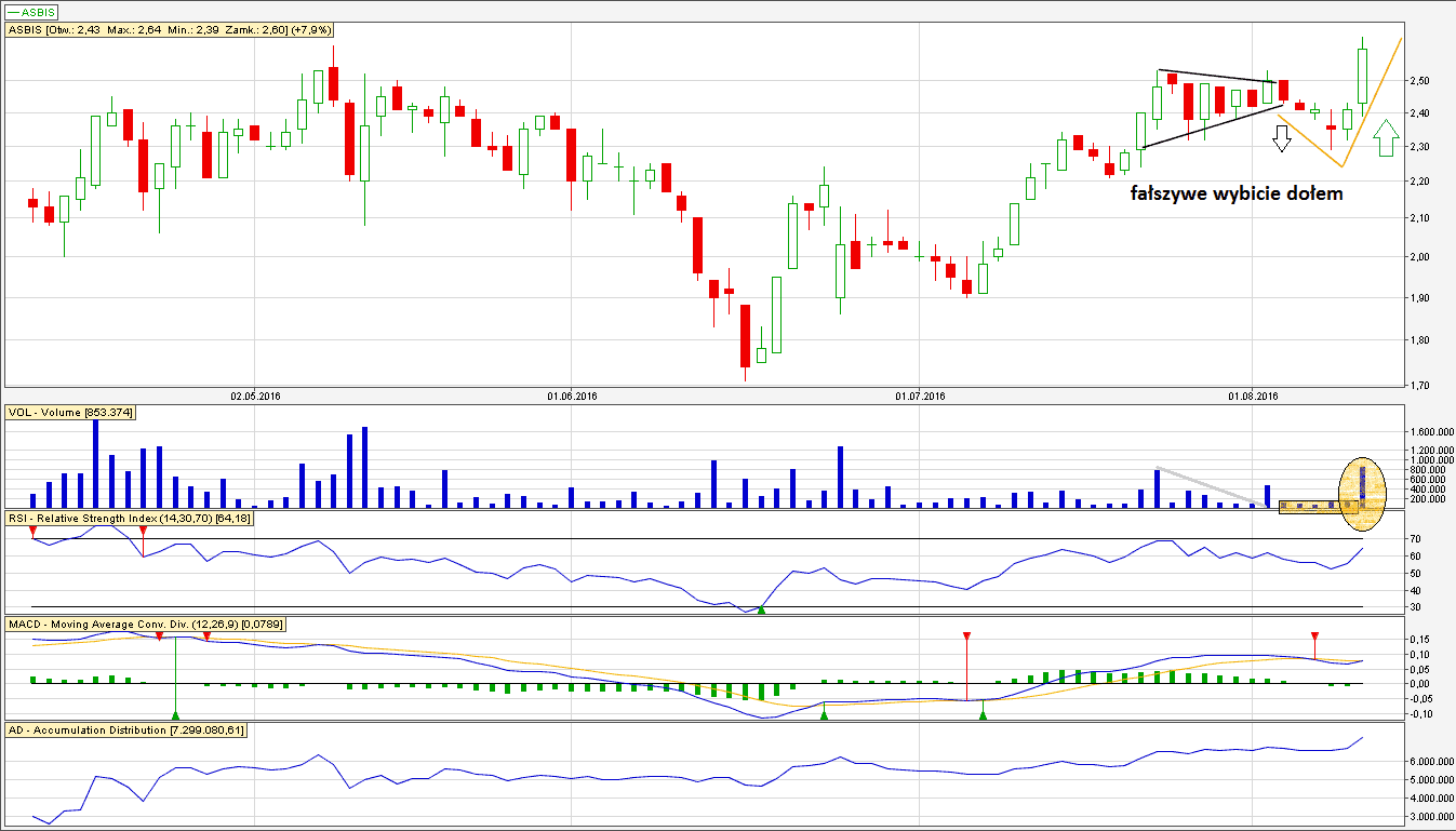 Takie fałszywe wybicie nastąpiło na ten przykład ostatnio na Asbis. Teraz jesteśmy przy 2-letnim oporze. Czy potwierdzi się ostatnia (środowa) świeca przekonamy się na sesji w czwartek (dzisiaj). My pod to właśnie zagrywaliśmy.