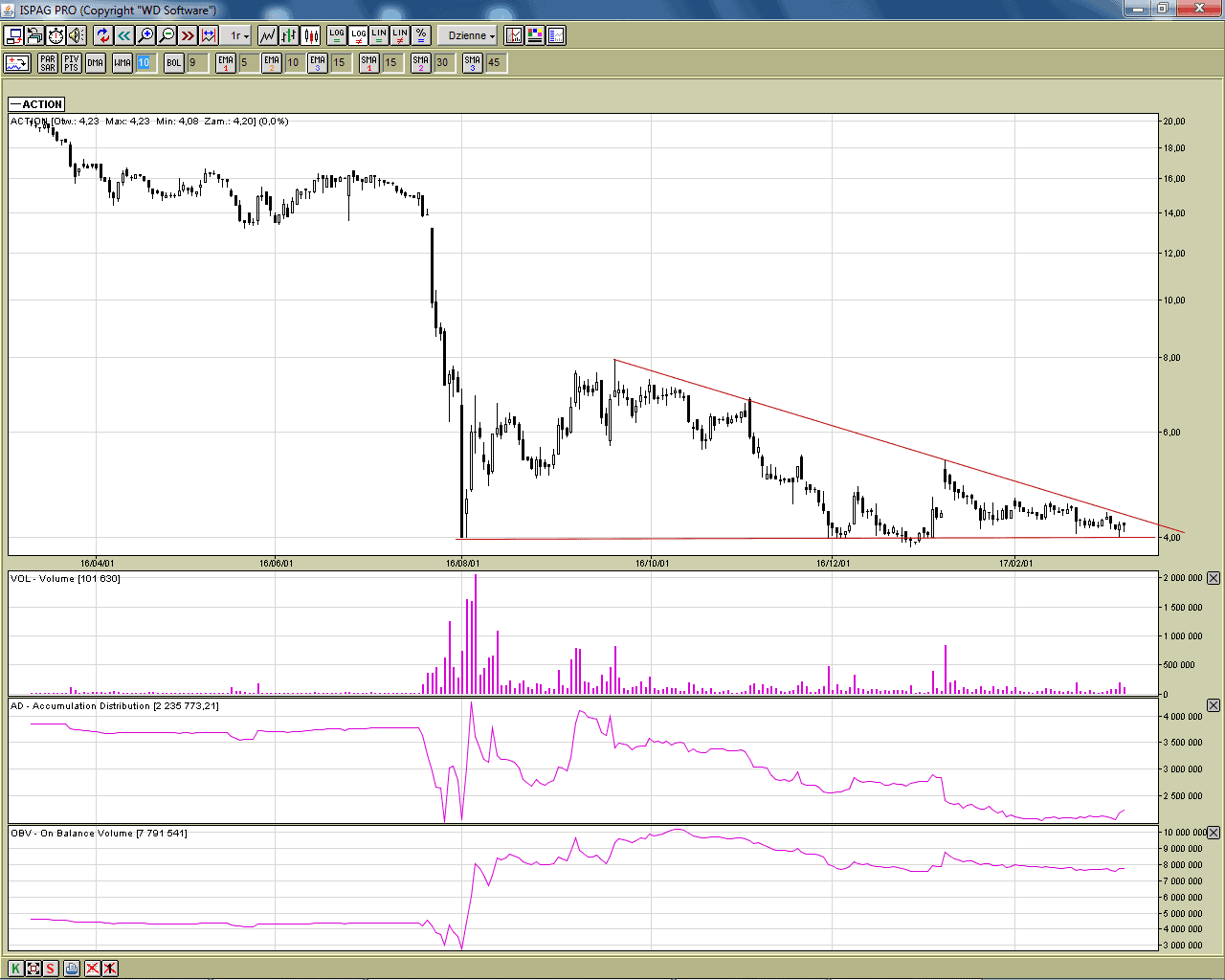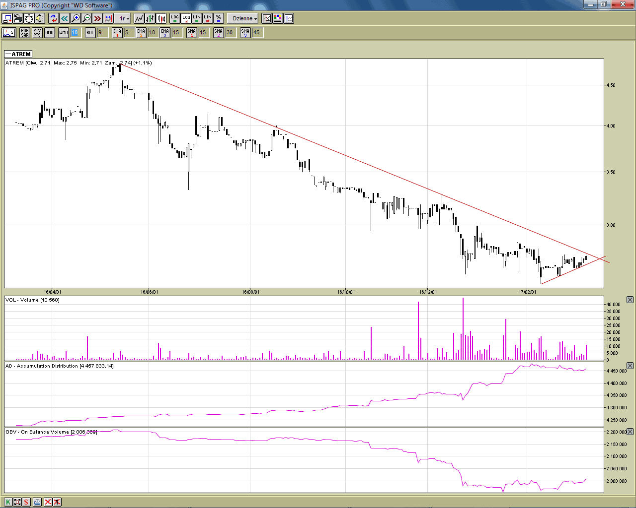 5. Atrem – długoterminowy trend spadkowy, cała budowlanka jest grana więc uważam że i tu będą zagrywać. Gramy na przebicie linii trendu.