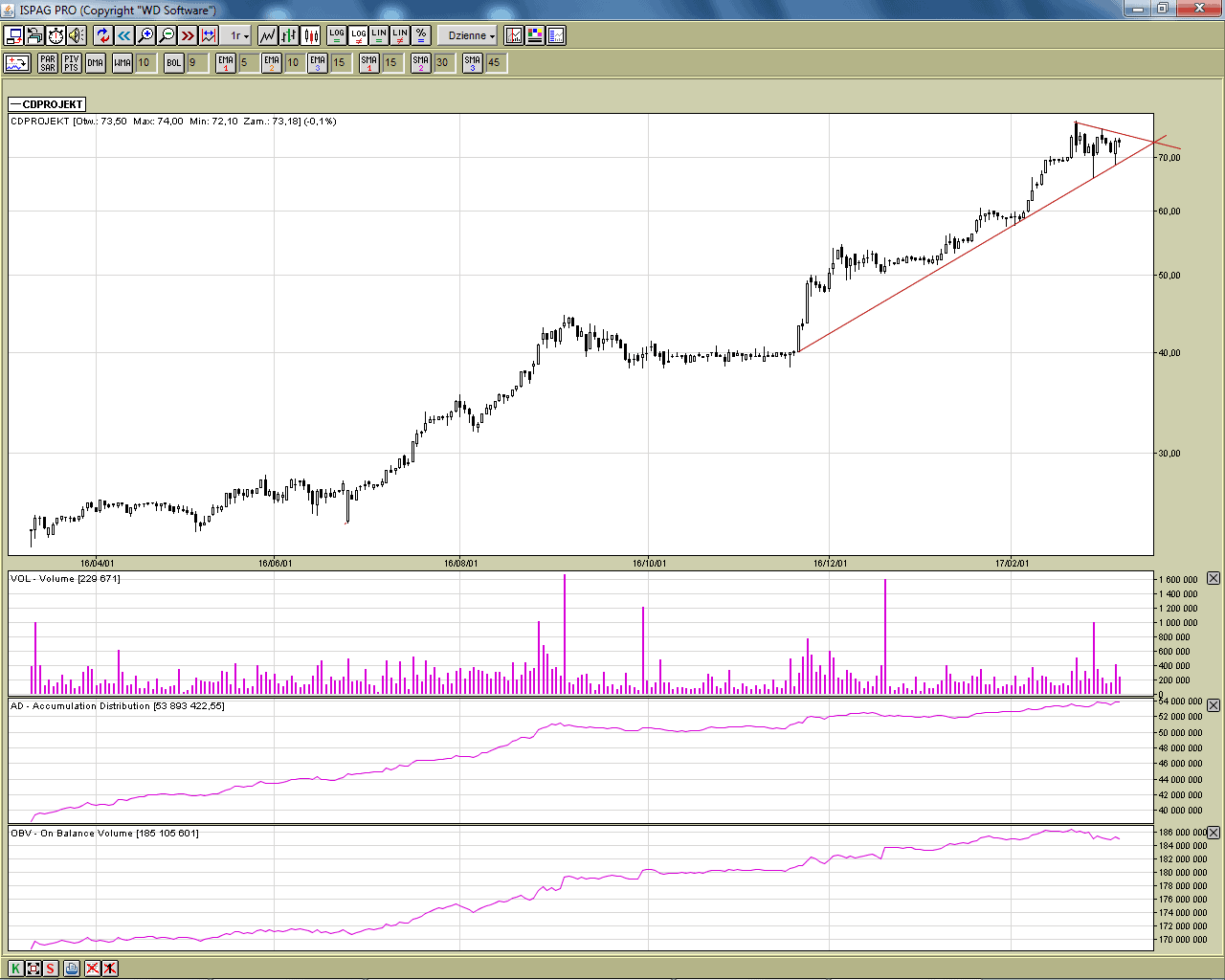 6. Cdprojekt – kurs respektuje linię trendu, zagrywamy na wybicie z lokalnego a’la trójkąta.