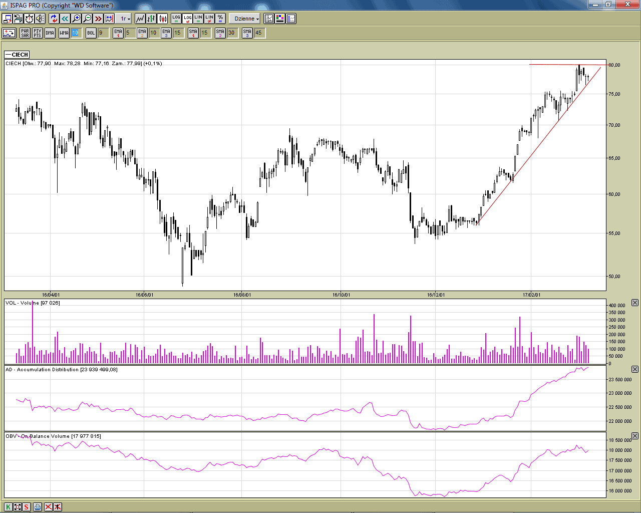 7. Ciech – zagrywamy na odbicie się od linii trendu wzrostowego.