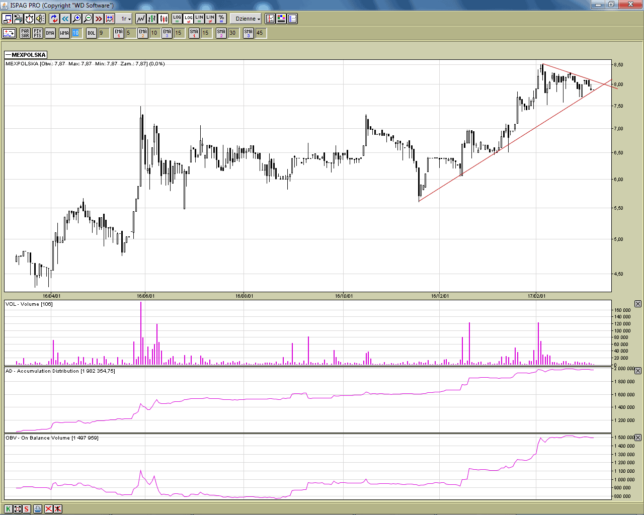 12. Mexpolska – kurs respektuje linię trendu wzrostowego, zagrywamy na przebicie linii korekty.