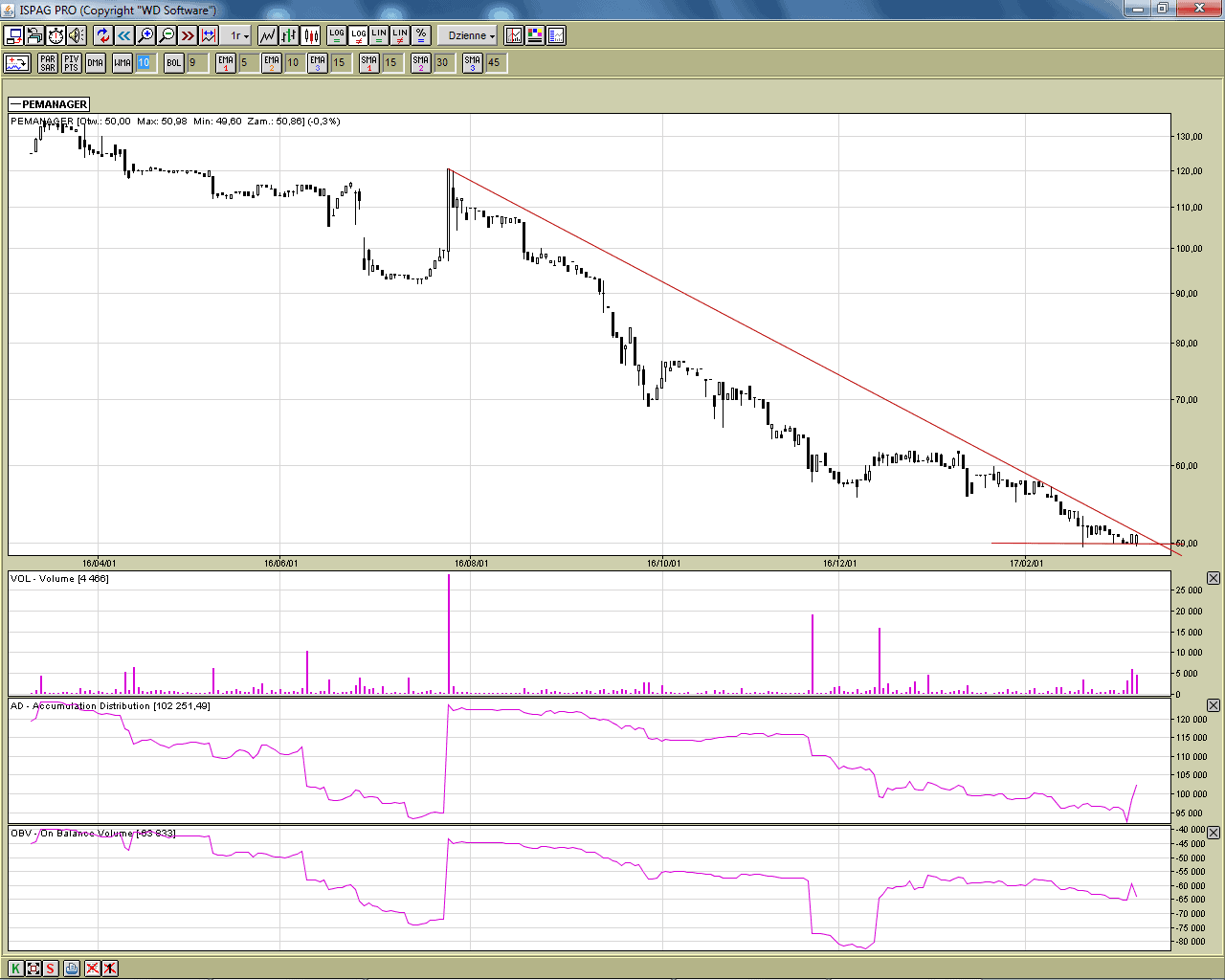 13. Pemanager – kurs znajduje się w trendzie spadkowym, zagrywamy na przebicie linii trendu.