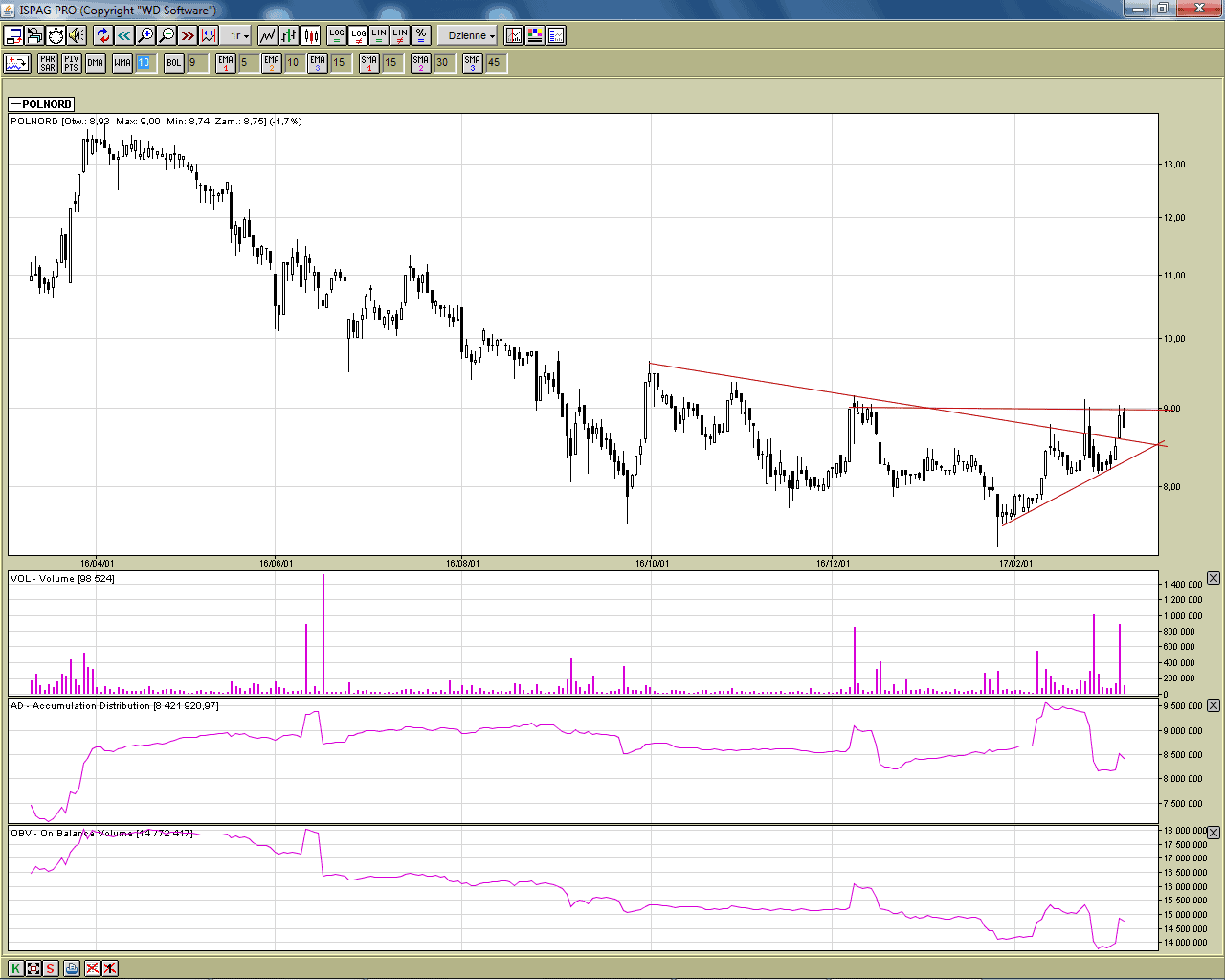 14. Polnord – na wykresie widać zwiększone obroty, zagrywamy po przebiciu 9,00 zł.