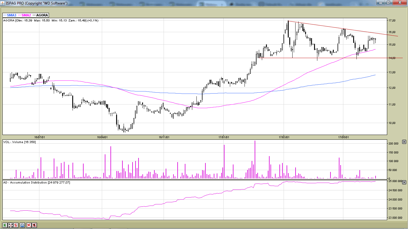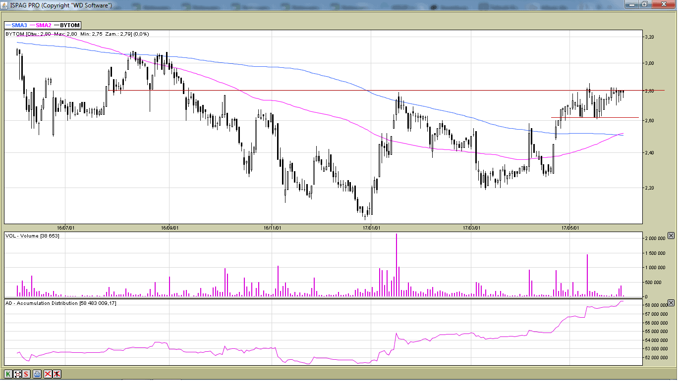 Kurs spółki od kilku tygodni porusza się w kanale spadkowym. Następuje konsolidacja i akumulacja akcji, co może oznaczać chęć wybicia z tego kanału.
