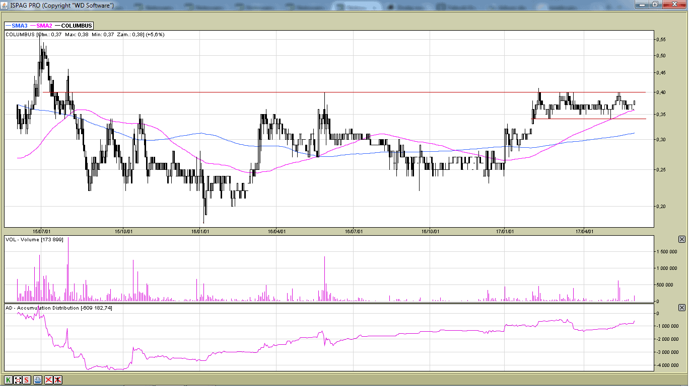 Kurs spółki konsoliduje się w przedziale 0,35-0,40 zł. Po pokonaniu tego oporu powinno dojść do dynamicznych wzrostów. Dodatkowo pozytywnym aspektem jest mocna poprawa wyników finansowych za 1 kwartał.