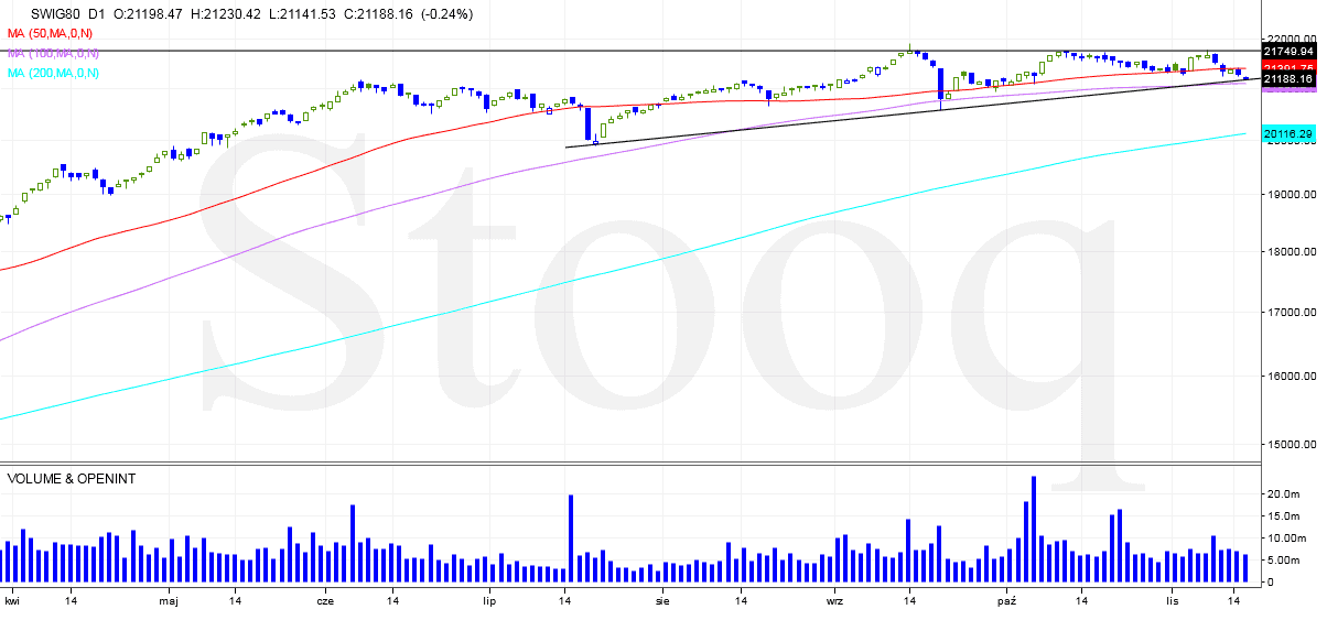Ten wpis jest poświęcony następującym spółkom: Agora, Stalprodukt, Vindexus. Zanim przejdziemy do właściwej części wpisu spójrzmy na sytuację na wykresach głównych indeksów giełdowych. Wykres WIG20 pokazuje, że kurs porusza się wewnątrz klina rozszerzającego się, gdzie kurs znalazł się tuż przy jego dolnym ograniczeniu. Może być to dobrym miejscem do zakończenia spadków i odbicia. Kurs MWIG40 od początku roku porusza się w kanale wzrostowym. Aktualnie kurs po odbiciu się od górnego ograniczenia znalazł się w połowie tego kanału, na razie dominują sprzedający. Kurs SWIG80 konsoliduje się tworząc a’la trójkąt zwyżkujący, gdzie kurs aktualnie znajduje się przy jego dolnym ograniczeniu to jest dobre miejsce do odbicia.